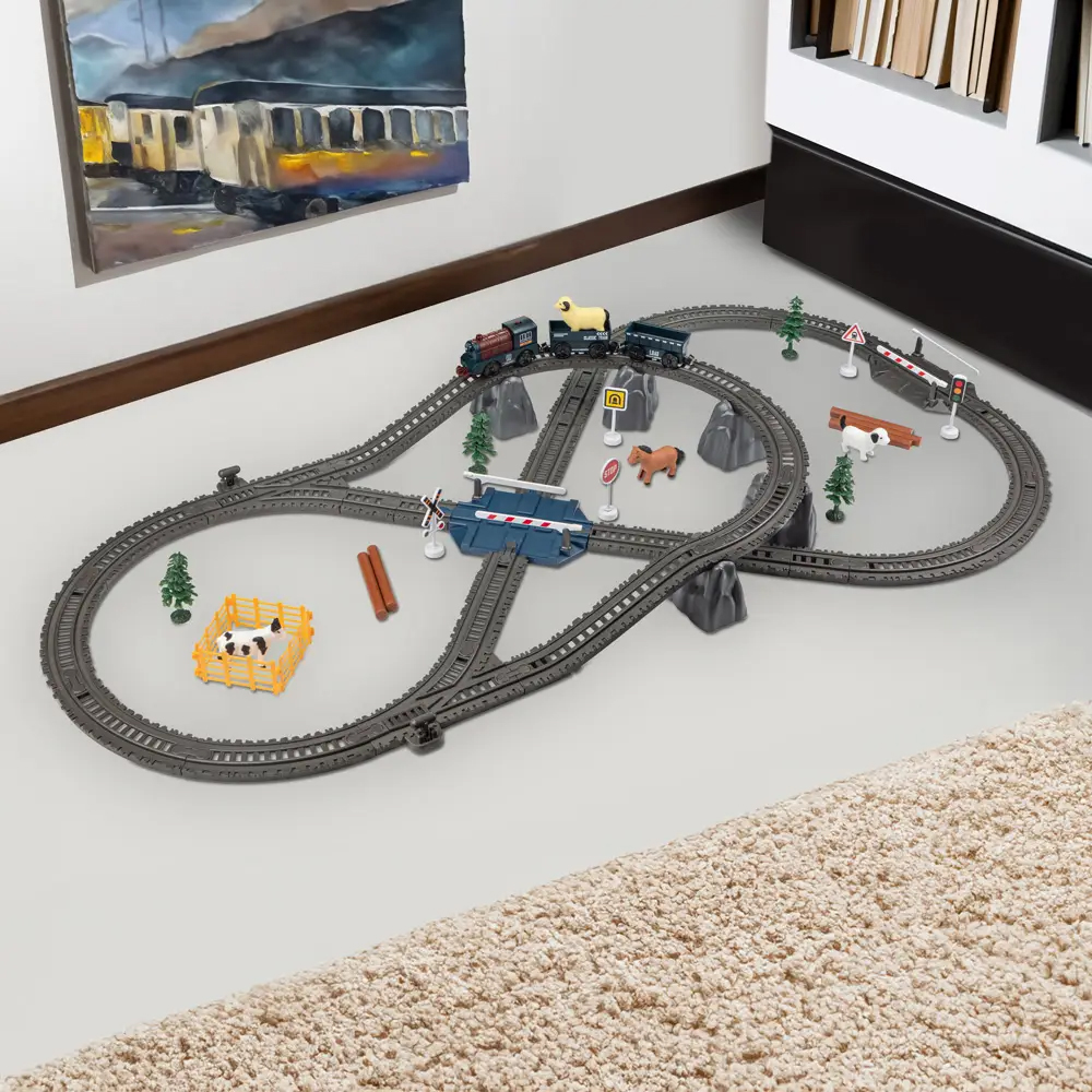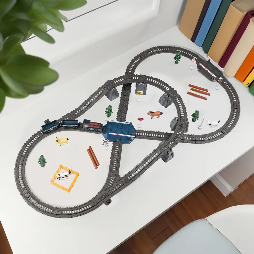 Електричні залізниці МАНДРІВНИЙ ЕКСПРЕС – це конструктори та тематичні ігрові набори одночасно. Спочатку дитина зможе побудувати залізну дорогу зі швидкісними спусками та крутими підйомами, а потім поринути в цікаву гру, вивчаючи правила дорожнього руху та взаємодію транспортних засобів і пішоходів. Реалістичні звукові ефекти руху потяга по цікавим схемам залізничних колій роблять гру захоплюючою та сприяють розвитку уяви малюка.