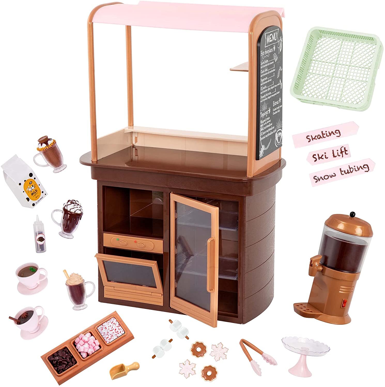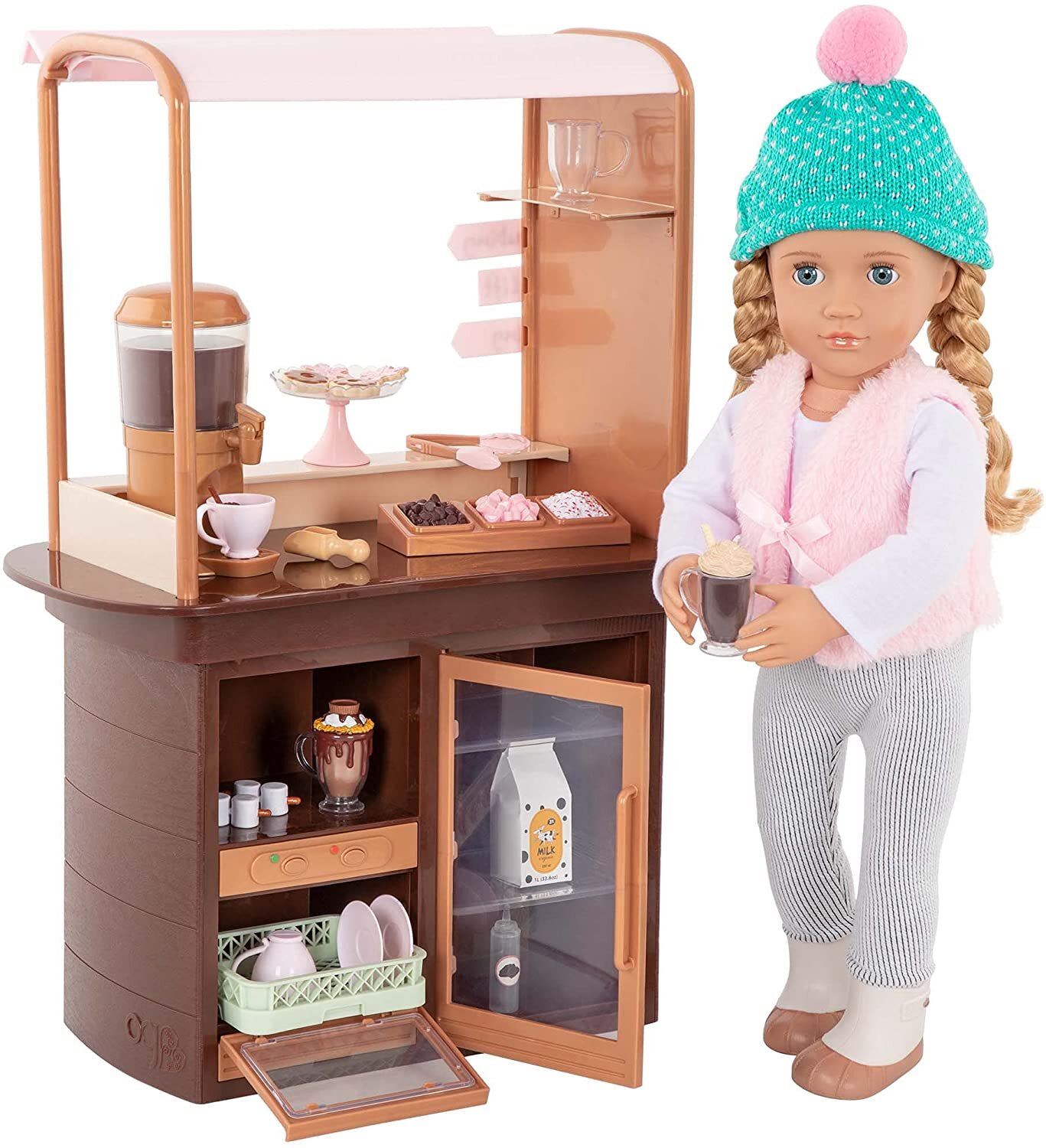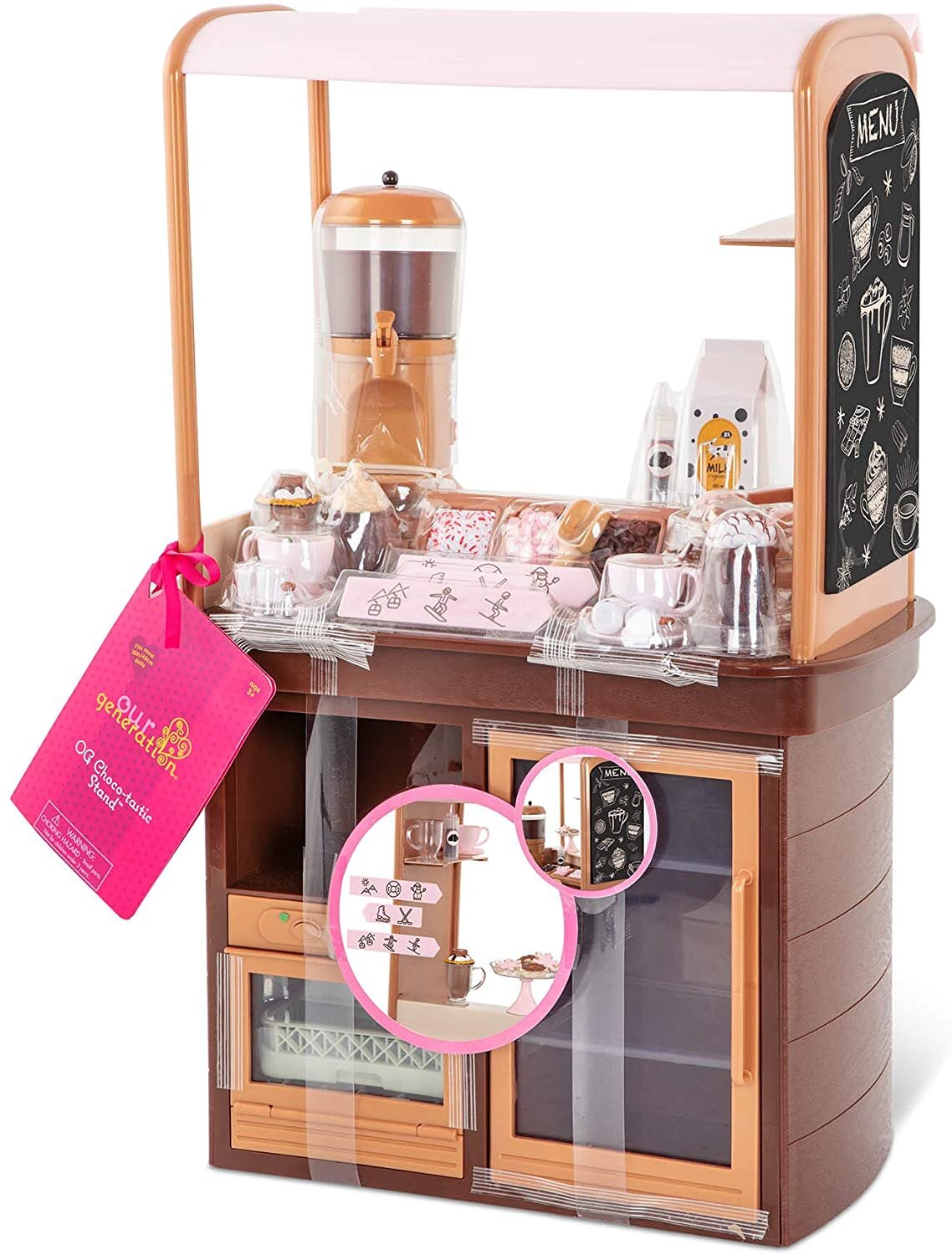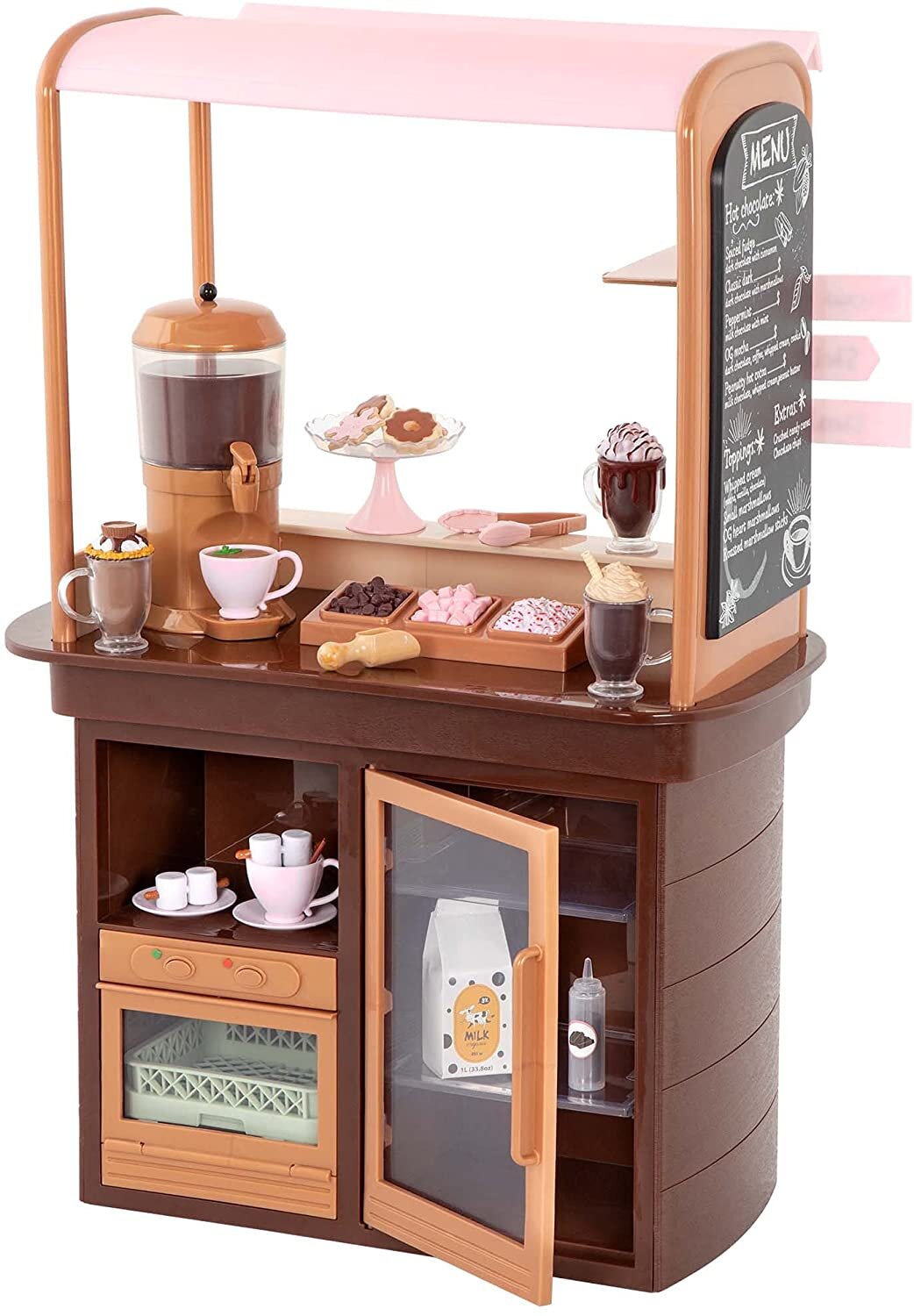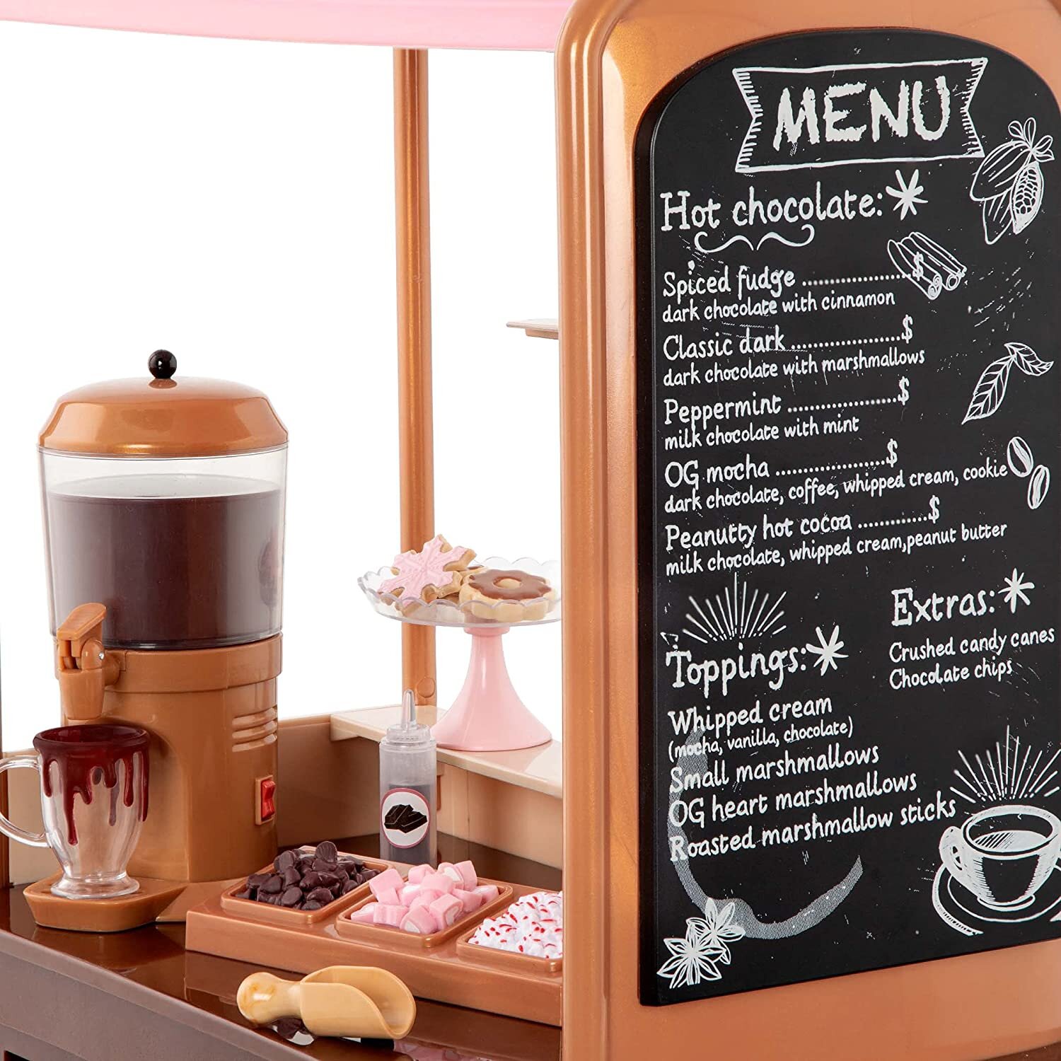 Насолоджуйтесь солодкими частуваннями зі своїми найкращими друзями з прилавком для Шоколаду Our Generation! Виберіть смачний десерт з дошки меню та приготуйтесь обслуговувати своїх клієнтів з посмішкою. Приготуйте 5 різних чашок гарячого шоколаду за допомогою машини для гарячого шоколаду, а потім прикрасьте кожну чашку зефіром, шоколадом та присипками з піддону для начинки! Хочете печива? Покладіть смачне цукрове печиво на вітрину та поставте його на прилавок. Потім за допомогою щипців роздайте їх своїм друзям.