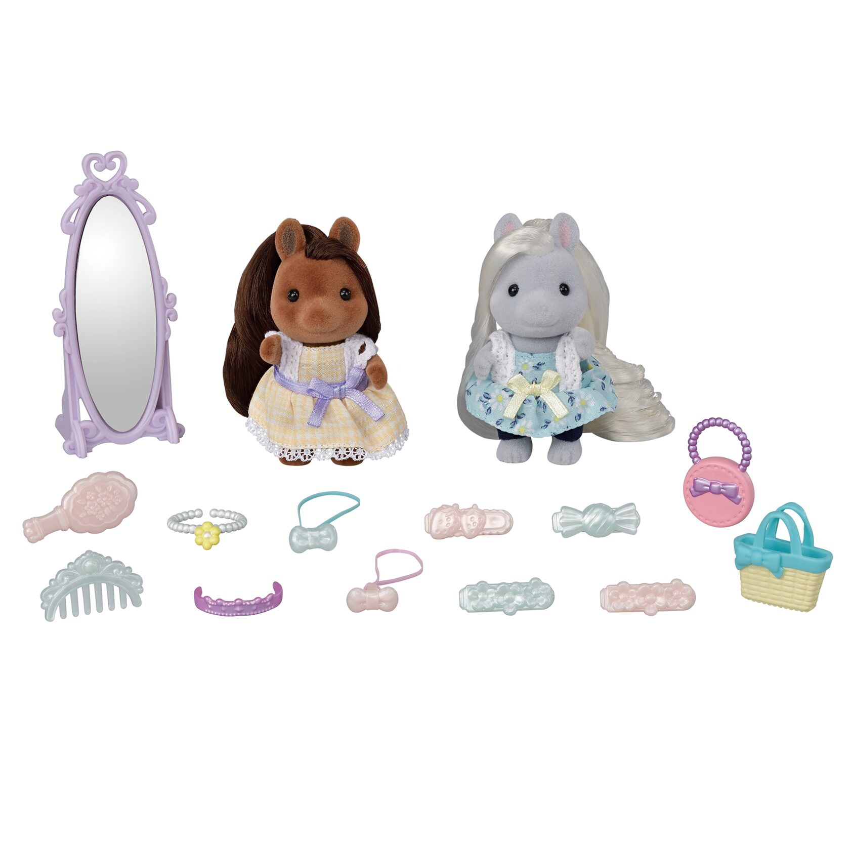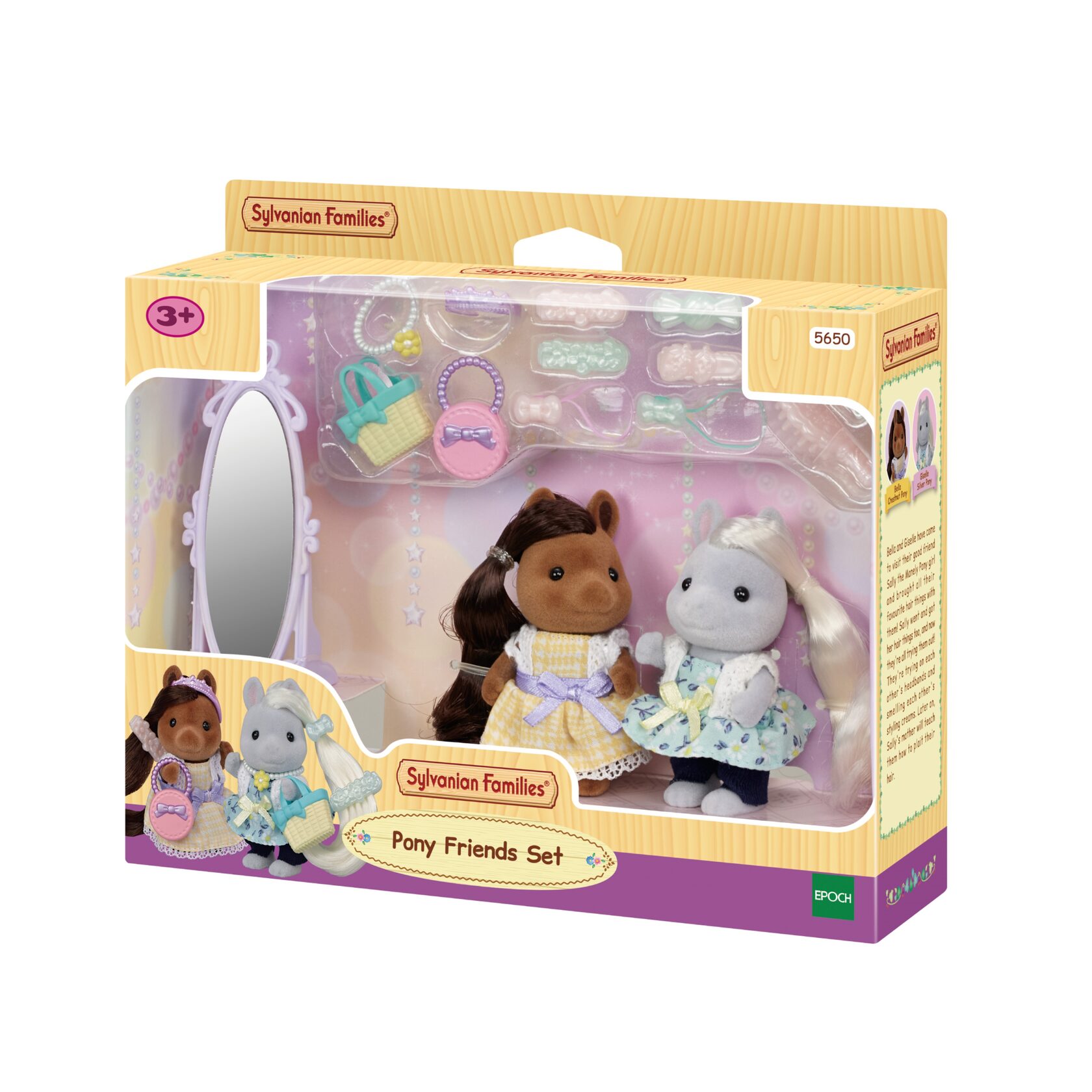Ігровий набір Подружки Полі Sylvanian Families 5650 - складається з двох фігурок дівчат-поні (6 см) з шовковистим довгим волоссям, напольного дзеркала, стильних прикрас,сумочок та аксесуарів для волосся. Робіть різні зачіски та доповнюйте образи реалістичними мініатюрними аксесуарами. Поні з каштановим волоссям одягнена в жовту сукню з мереживом, а сріблянка - у квітастий сарафан та сині штанці.