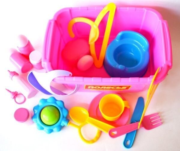 В наборі: нічний горщик, соска, пляшечка для годування, брязкальце, ємкості для присипки, пляшечки, плічики, гребінець, слюнявчик, блюдце, чашка, ложка, нож, виделка.