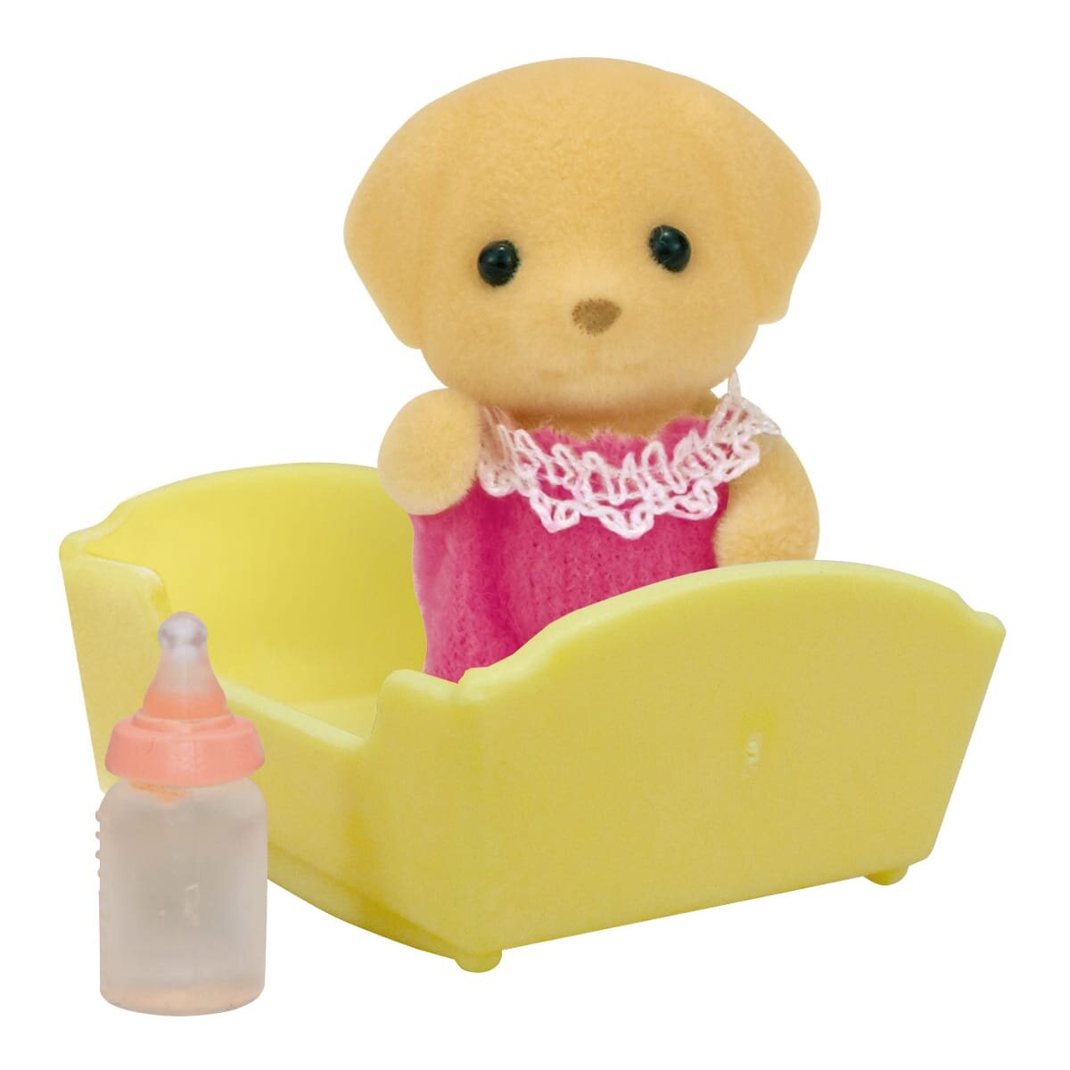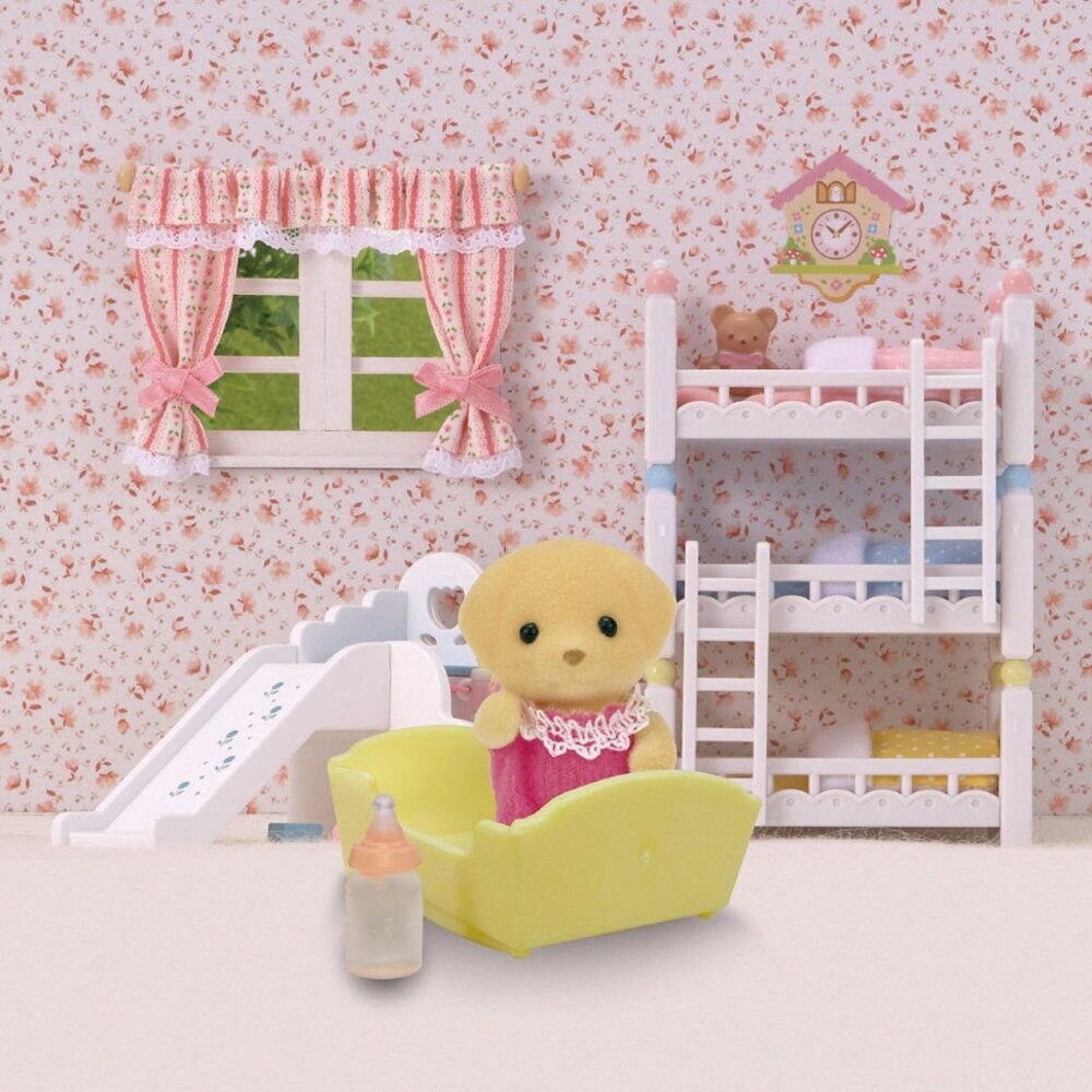 В ігровому наборі Sylvanian Families 5187 ви знайдете Цуценя у малиновому комбінезоні з мереживом, ліжечко та пляшечку для годування. Усі предмети виготовлені з міцного, безпечного пластику. Мають стандартні параметри, тому сумісні з усіма наборами "Сільваніан Фемелі".
