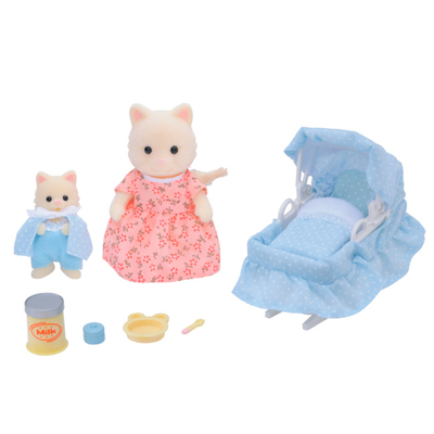 У ігровому наборі Sylvanian Families Мама-кішка з малюком та колискою є мама-кішка Міріам Шантільї, її малюк Жак, колиска-люлька та аксесуари для догляду за малюком, доречні у перші місяці його життя.
