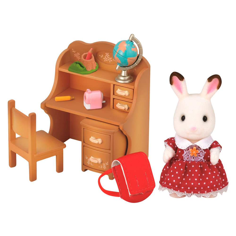 Малеча з родини Шоколадних кроликів пішла до школи. Вона обожнює свою нову парту з усіма її поличками і ящиками. У кролиці є глобус, шкільна сумка, підставка для олівців, і паперу. Кроленяті так подобається вчитися, що найчастіше ввечері її можна знайти за своєю партою, там вона робить домашнє завдання. Також кроленя любить писати листи і малювати малюнки для своїх улюблених друзів. У комплекті з кроленям і партою є безліч додаткових аксесуарів.
