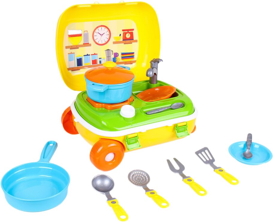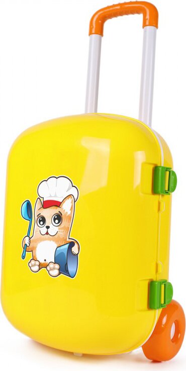 Тепер іграшкова кухня з посудом доступна в яскравій валізі з якісного пластику. Кухонний набір всередині валізи — це подвійна радість для дитини. На малюка чекають не тільки цікаві ігри з кухнею, але й захопливий процес розпакування валізи та дослідження його вмісту: іграшкової кухні, тарілок, чашок, іншого кухонного приладдя. Для додаткового комфорту малюків відкрита кришка валізи фіксується в декількох положеннях. Усередині валізи (на внутрішній стороні кришки) є цікава наклейка, що імітує кухонну полицю.