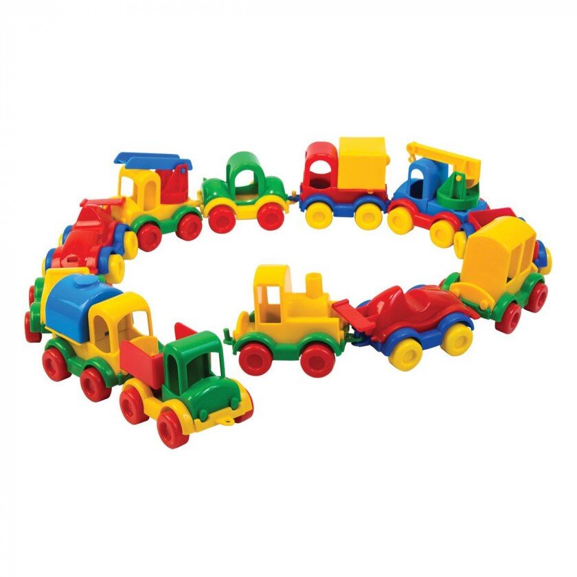 В наборі 12 машинок: потяг, вагони, пожежна машина, бетономішалка, самоскид, причіп, кран; яскраві кольори і надійна конструкція; машинки сумісні з іншими наборами серії Kid Cars.