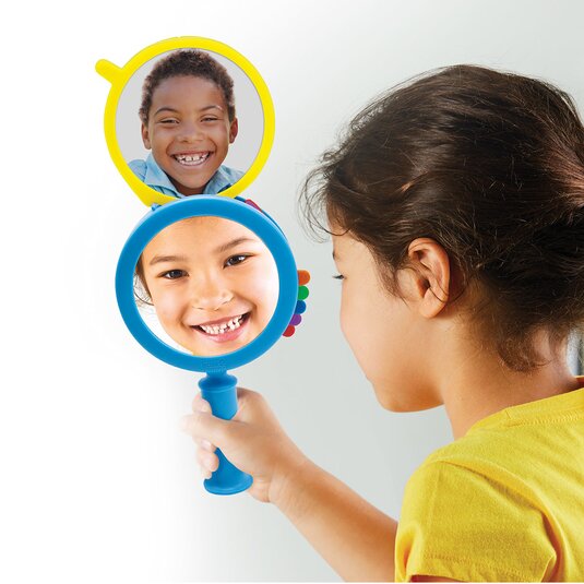 Навчальний ігровий набір із дзеркалом LEARNING RESOURCES МОЇ ЕМОЦІЇ допоможе дітям побачити та навчитися розпізнавати свої емоції та емоції інших людей. Це дуже важливо задля соціально-емоційного розвитку дитини. Допоможіть малюкові побачити та ідентифікувати емоції в собі та в інших людях, використовуючи дзеркало та шість слайдів-фотографій реальних дітей, які виражають справжні емоції: щастя, подив, страх, смуток, легковажність та гнів.