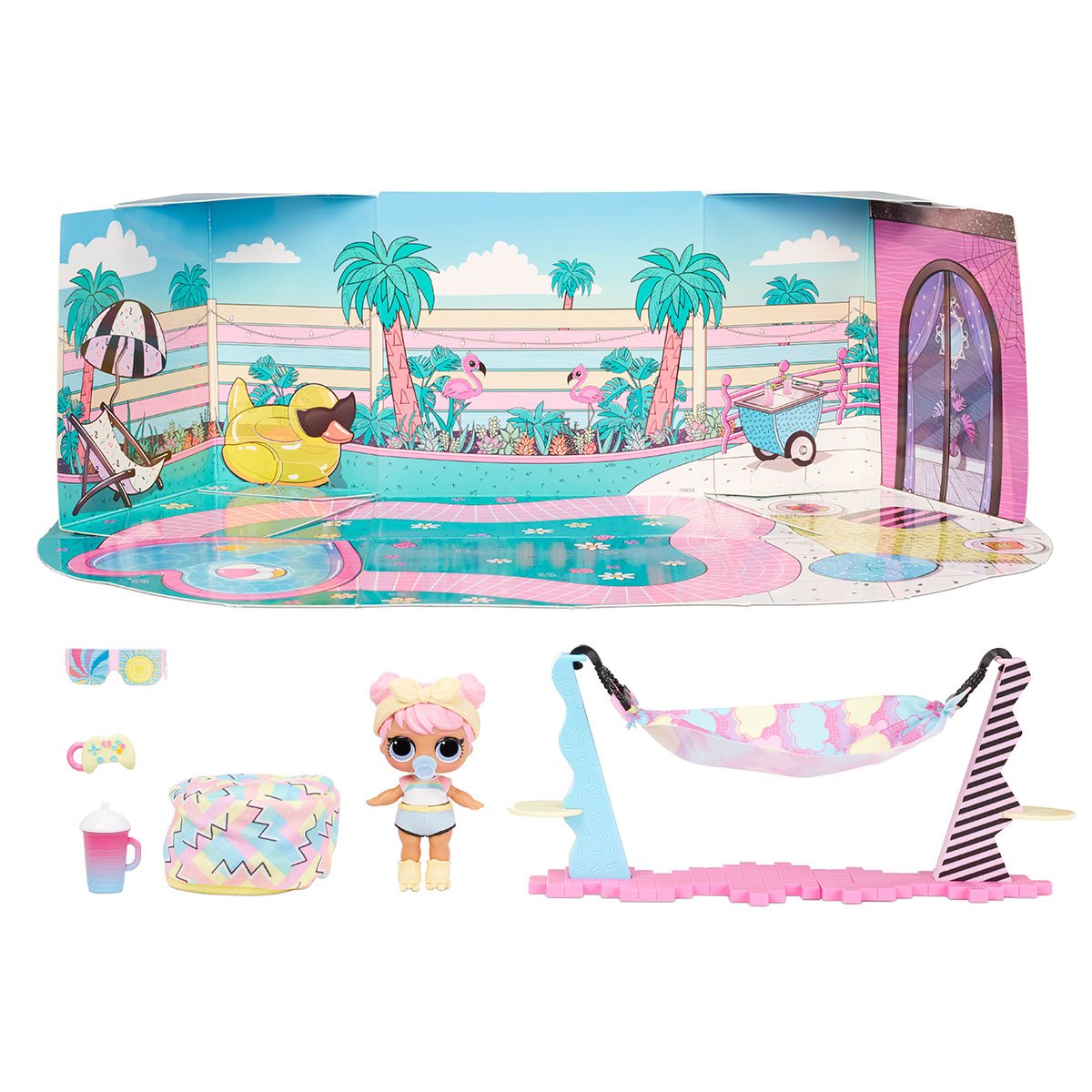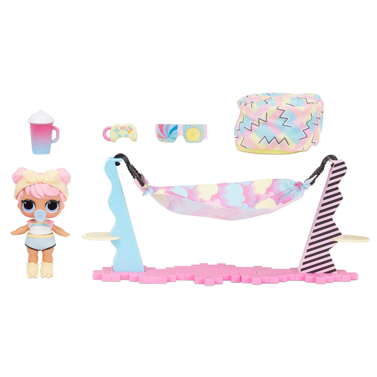 До набору входить: Лялька L.O.L. SURPRISE!; Коробка-фон; 2 предмети меблів для ляльки; Пляшечка; Взуття для ляльки; Одяг для ляльки; Аксесуари.