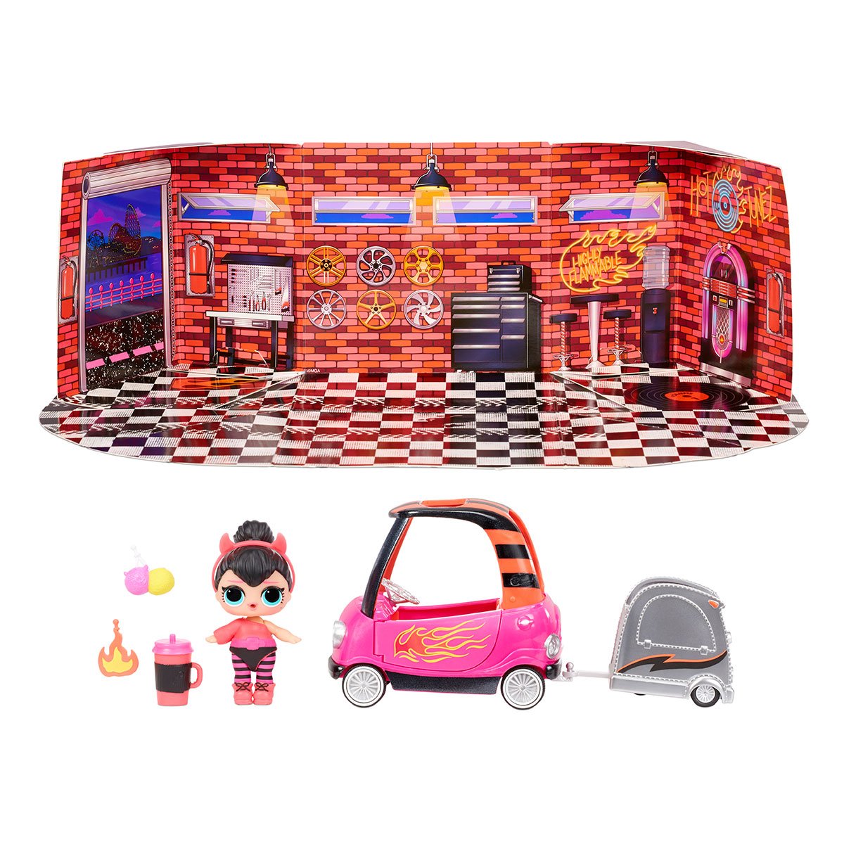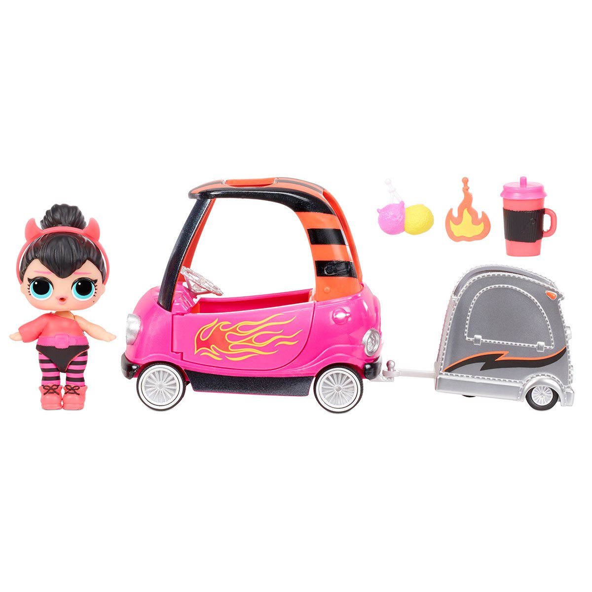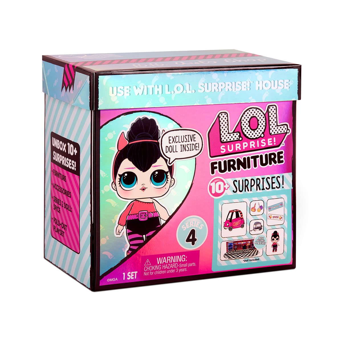 До набору входить: Лялька L.O.L. SURPRISE!; Коробка-фон; 2 предмети меблів для ляльки; Пляшечка; Взуття для ляльки; Одяг для ляльки; Аксесуари.