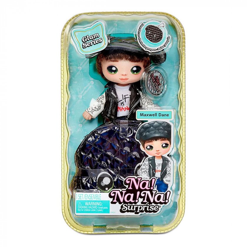Зустрічайте Ігровий набір з лялькою NA! NA! NA! Surprise Glam Максвелл Дейн з нової серії! Тепер іграшки-вихованці виконані з гламурної тканини з металевим ефектом і стануть відмінним стильним аксесуаром для дівчинки. Вибирайте улюблену колекційну м'яку ляльку і іграшку-улюбленця на кліпсі або зберіть усю колекцію! Персонаж Максвелл Дейн одягнений в чорний капелюх і світшот із забавним принтом. Його улюбленець – чорне цуценя.