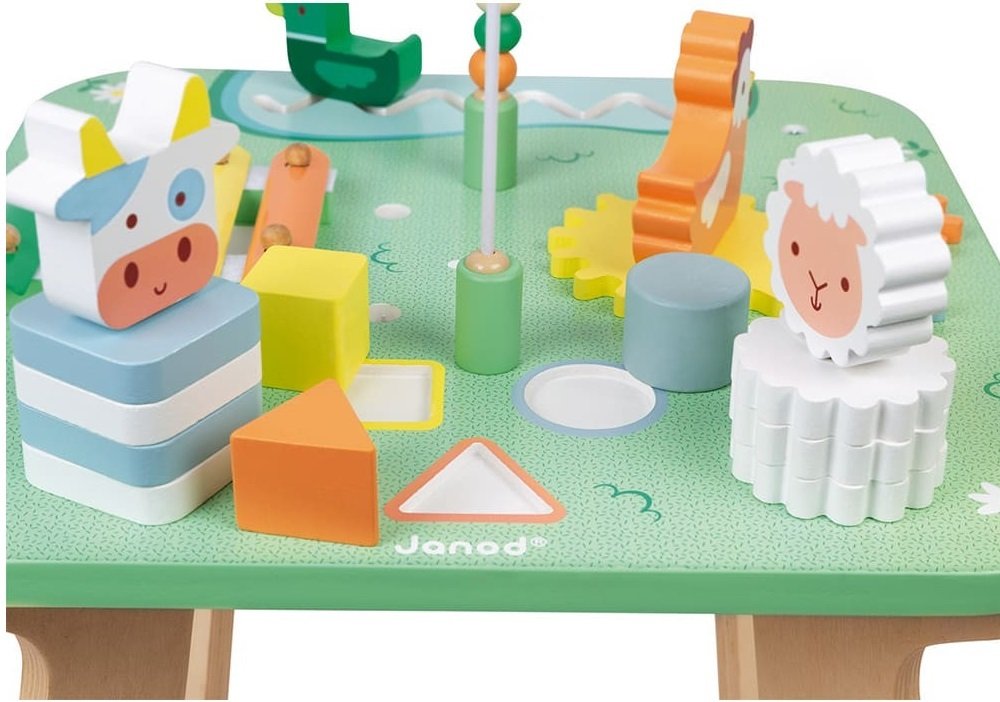 Відправляйтеся в сільську місцевість на поля з красивими квітами за допомогою багатофункціонального столу, на якому зображені всі улюблені дітьми домашні тварини. Набір пропонує дітям сім цікавих занять: складання двох тварин різними способами для розвитку моторики; лабіринт з качкою, що гуляє навколо свого ставка, призначений для розвитку координації; обертання шестерні, щоб зрозуміти причинно-наслідковий зв'язок; три вбудованих кубика для вивчення форм; рахунки; металевий ксилофон з двома стукалками для розвитку музичних здібностей. Цей стіл призначений для дітей від 12 місяців, його висота - 32 см. При виготовленні використана безпечна фарба на водній основі.