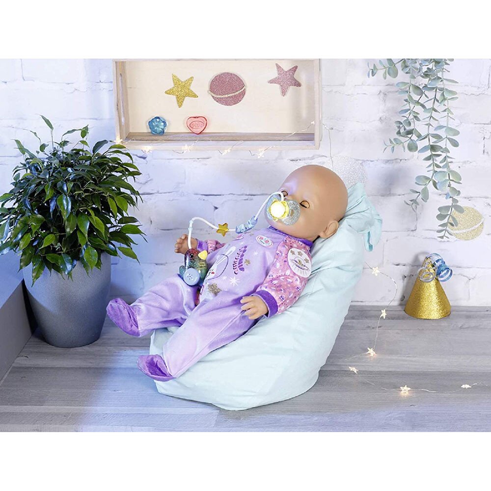 Інтерактивна пустушка для ляльки BABY born Чарівна пустушка. Щоб Ваша BABY born не плакала, окрім пляшечки та кашки їй потрібна ще пустушка. Зараз вона стала ще яскравішою – з новим дизайном, звуковими ефектами та миготінням! Ще одна вважлива особливість – ця пустушка незвичайна. Вона підходить для ляльок нової серії «Чарівна дівчинка» та «Чарівний хлопчик»! Це означає, що вона також «чарівна» і не дасть малятам BABY born заснути, якщо їх покласти горизонтально.