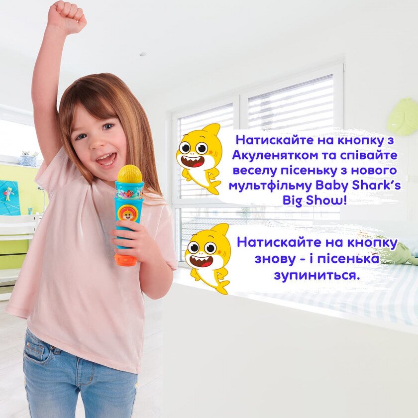 Особливості інтерактивної іграшки Baby Shark Big Show Microphone: легке керування – натискання та зупинення пісні однією кнопкою; офіційно ліцензований продукт; високоякісні безпечні матеріали; робота завдяки 2 батарейкам типу ААА (входять до комплекту); сприяє розвитку уяви, музичного слуху, креативного мислення.