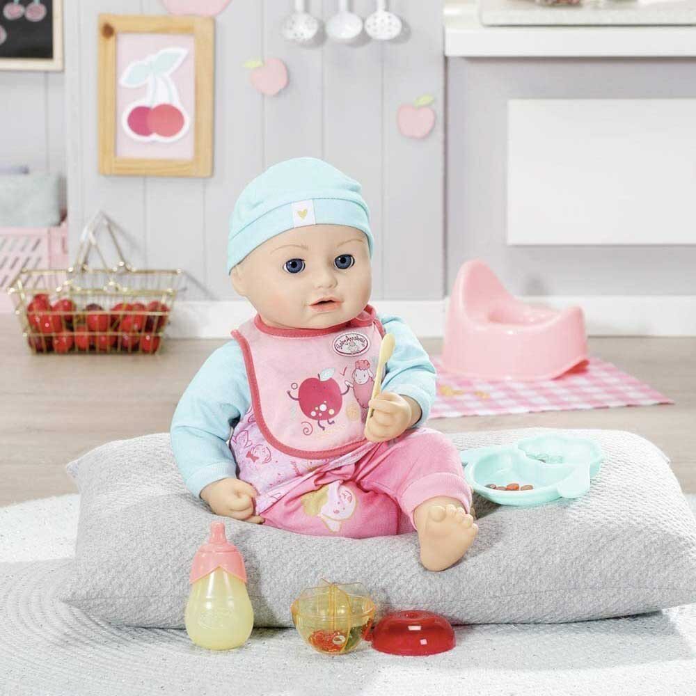 Інтерактивна лялька Zapf Baby Annabell Ланч крихітки Аннабель — чудова забавка для малюка! Особливості: лялька видає звуки, ходить на горщик та заплющує очі, коли лягає; якщо піднести ложечку до рота Анабель, вона його відкриє; щоб лялька сходила на горщик, треба посадити її на нього і натиснути на животик.
