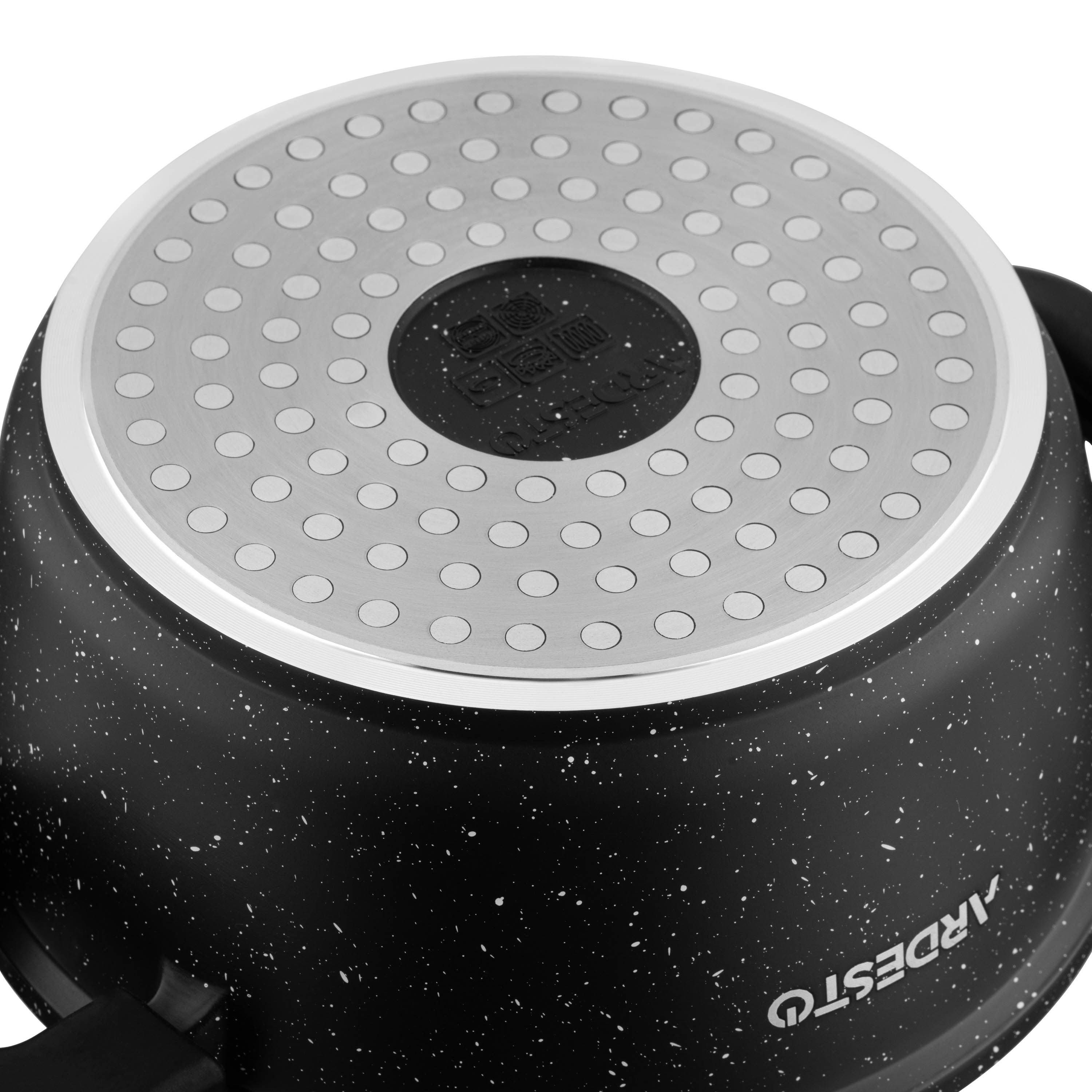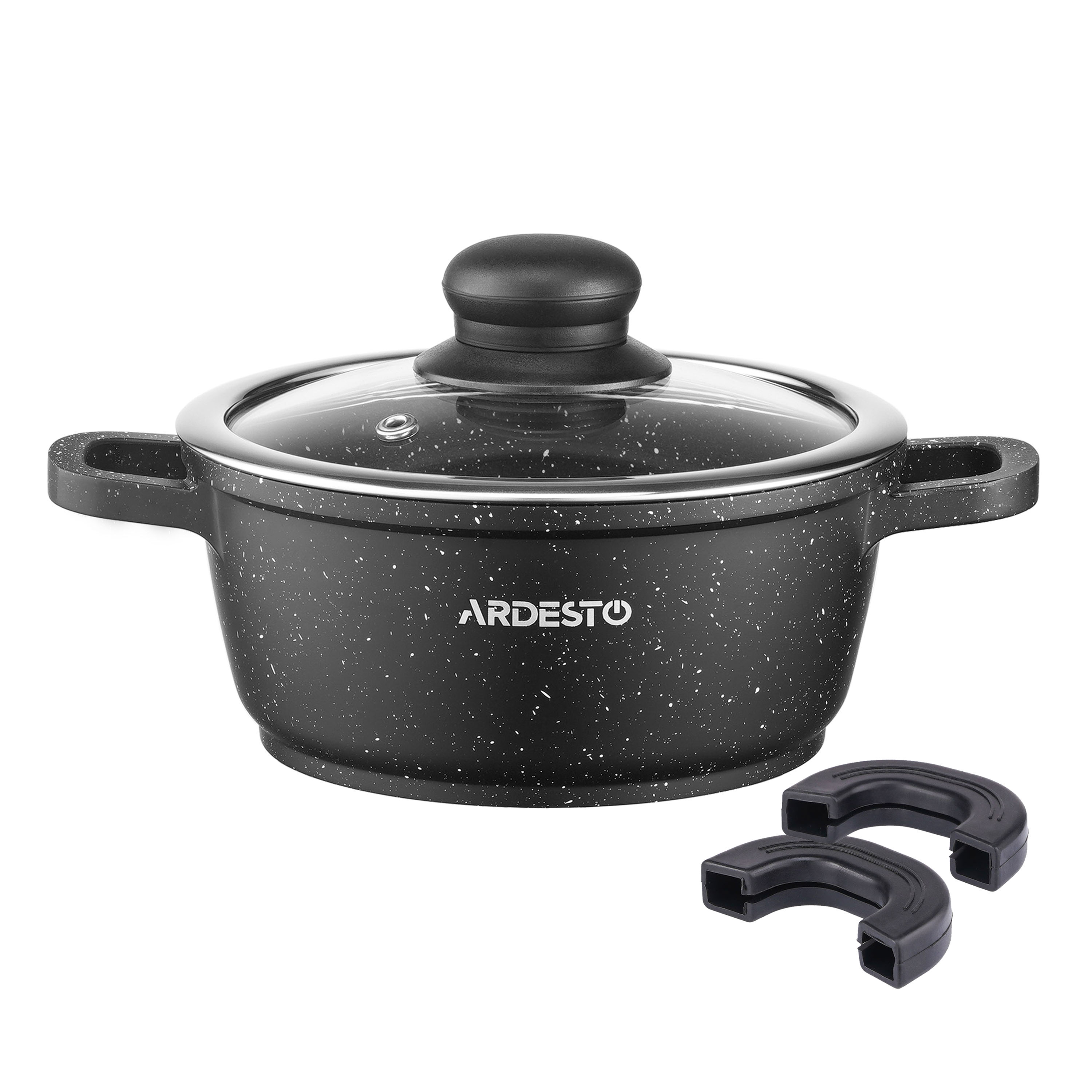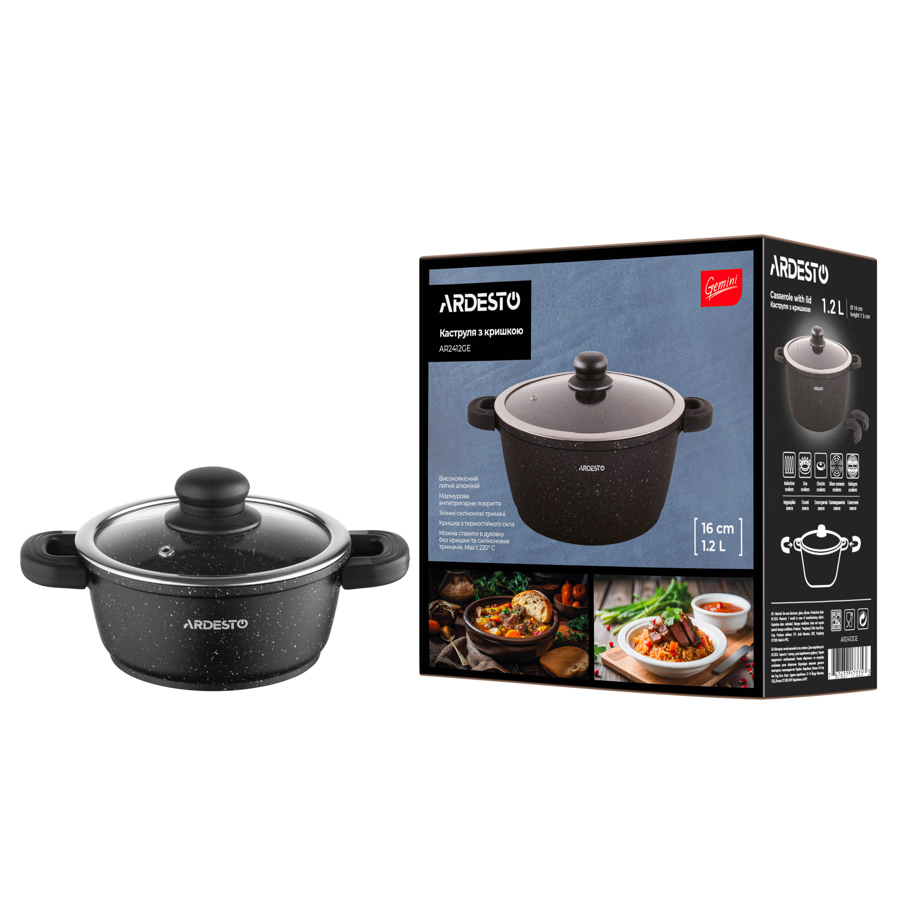 Каструлю ARDESTO Gemini Anzio виготовлено з литого алюмінію. Її об’єм становить 1,2 л, а діаметр – 16 см. Стінки завтовшки 1,5 мм, тоді як товщина дна становить 4,3 мм – запорука рівномірного нагрівання. Завдяки протипригарному мармуровому покриттю процес приготування буде суттєво простішим. Особливістю виробу є знімні силіконові накладки на алюмінієві руків’я, які забезпечують комфортне та безпечне переміщення каструлі, навіть коли її розігріто. Скляна кришка, яка також є в комплектованні, має отвір для відведення пари. Каструля ARDESTO Gemini Anzio сумісна з усіма видами плит, а саме: газовими, електричними, склокерамічними, галогенними та індукційними. Допустиме миття в посудомийній машині.