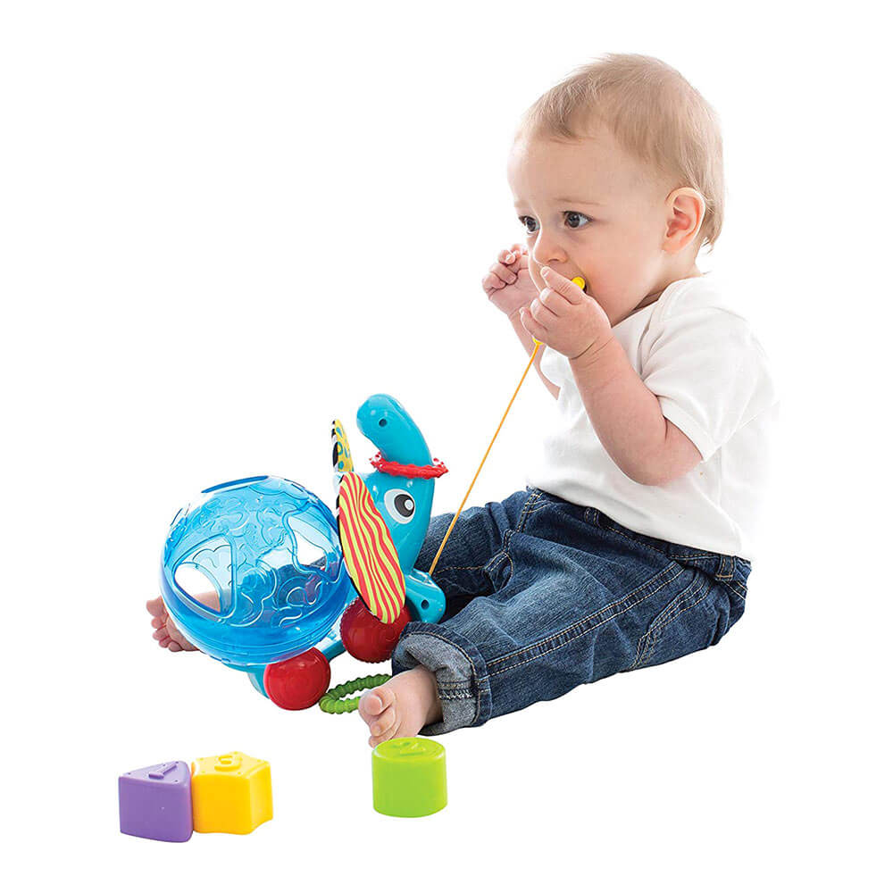 Чудова пропозиція від торгової марки Playgro – каталка із сортером, яка подарує дитині захопливе та різноманітне дозвілля. Іграшка пропонує кілька варіантів гри. Слоника можна просто катати за мотузку. У прозорій спинці слона є отвори, в які малюк зможе вкладати різнокольорові фігурки за принципом сортера. На хобот слона одягаються три різнокольорових кільця. Їх можна використовувати в якості прорізувачів для ніжних ясен дитини. У вушках заховані елементи, котрі шарудять, що обов'язково приверне увагу дитини.