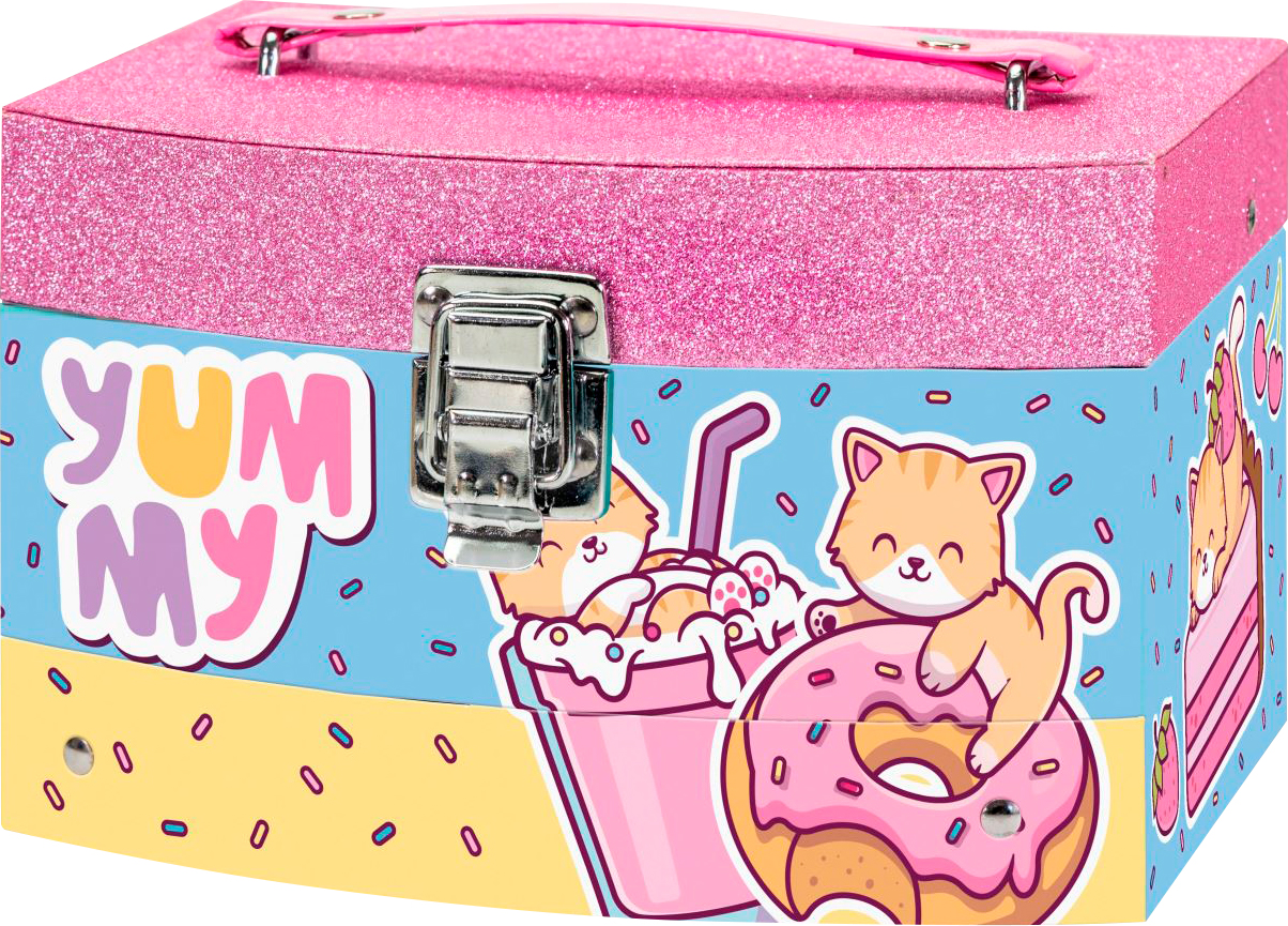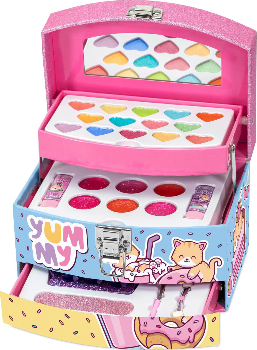 Набір косметики Martinelia Yummy у кейсі з трьома висувними рівнями. При відкритті кейса всі рівні автоматично виїжджають і перед дитиною відкривається вся краса, яка є усередині кейсу. На верхньому – тіні для очей на палетці, на середньому – блиски та бальзами для губ, а на нижньому – пензлики та штучки для бездоганного педикюру. На внутрішній стороні кришки кейса є дзеркало для зручності при нанесенні макіяжу.