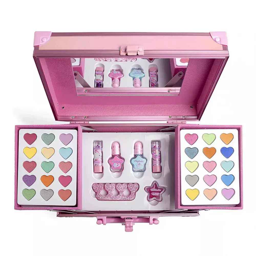 Усі засоби зібрані в одному зручному кейсі, який легко брати із собою у подорож або на гості, а після гри косметику можна акуратно скласти назад, щоб нічого не загубилося.