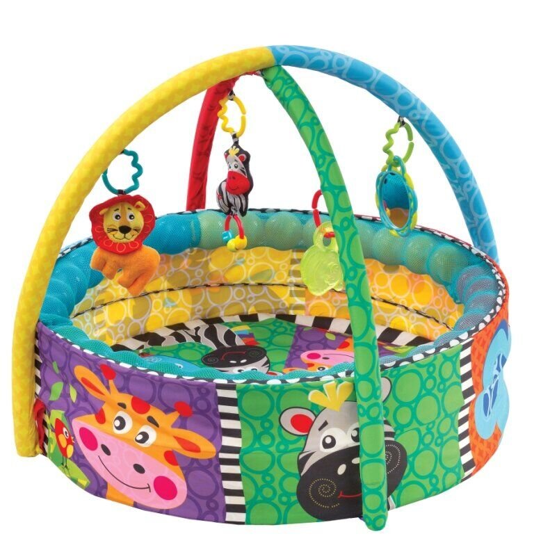 Килимок Playgro Басейн - ігровий майданчик, в якій передбачено безліч цікавих ігор. Басейн оснащений іграшками у вигляді фігурок тварин, дзеркалом і іграшками, які здатні видавати звуки. Деякі іграшки мають знімне зубне кільце. До килимку додається пакет з кульками, які розвивають дрібну моторику пальців малюка. Щоб зручніше грати з кульками, бортики килимка складають у вигляді гніздечка.