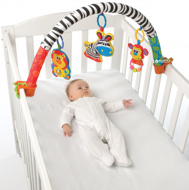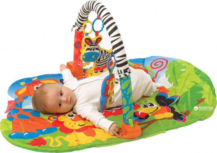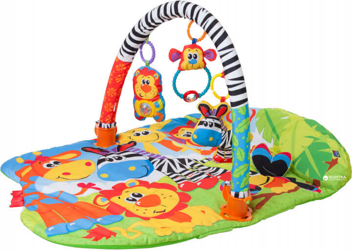 На розвивальному килимку Сафарі від відомої торгової марки Playgro так цікаво грати та знайомитися з навколишнім світом. Зручний килимок оснащений м'якою подушечкою та дугами з навісними іграшками.