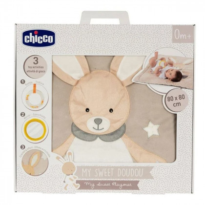 ОСОБЛИВОСТІ КИЛИМКА РОЗВИВАЮЧОГО CHICCO MY SWEET DOUDOU: м'який плюшевий килимок виконаний з високоякісного гіпоалергенного матеріалу; декорований зображенням кролика з об'ємними вушками; дві знімні іграшки: дзеркальце та брязкальце; нейтральне забарвлення для дівчаток та для хлопчиків; подарункова упаковка; рекомендації щодо догляду: дозволене машинне та ручне прання.