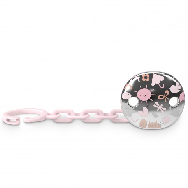 Зручна система кріплення дозволяє причепити пустушку до одягу малюка. Пластиковий ланцюг з великими ланками оснащений металевою кліпсою з рожевим принтом.