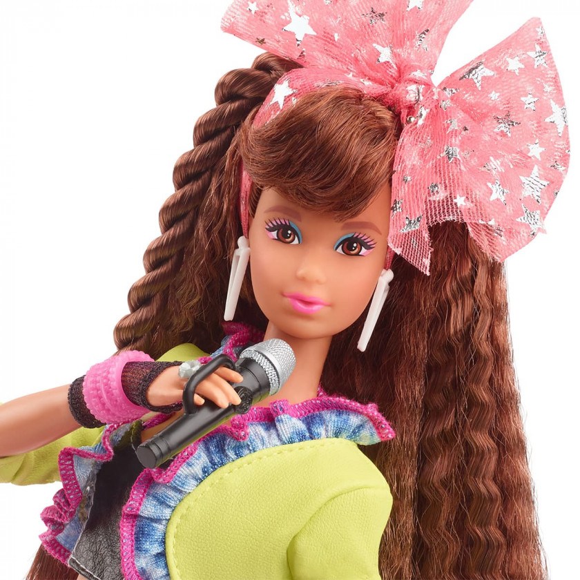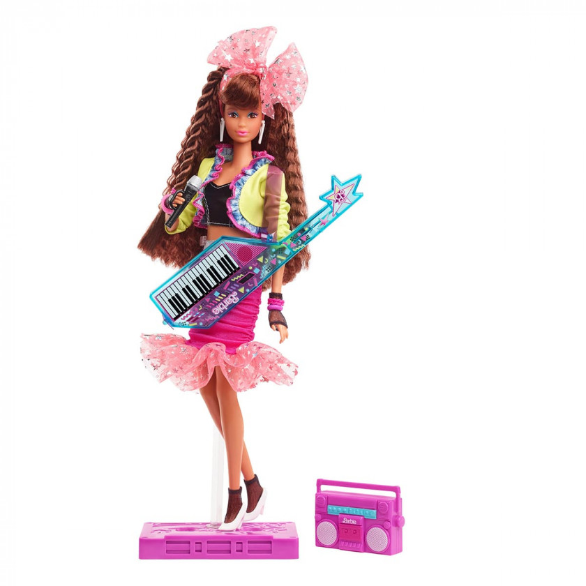 Особливості колекційної ляльки Barbie Вечірня прогулянка: приголомшливий наплічний синтезатор, а також бумбокс і мікрофон допоможуть запалити на сцені; лялька не може стояти самостійно; гнучкі лікті; у набір входять: сертифікат достовірності, лялька, підставка у формі касети, аксесуари.