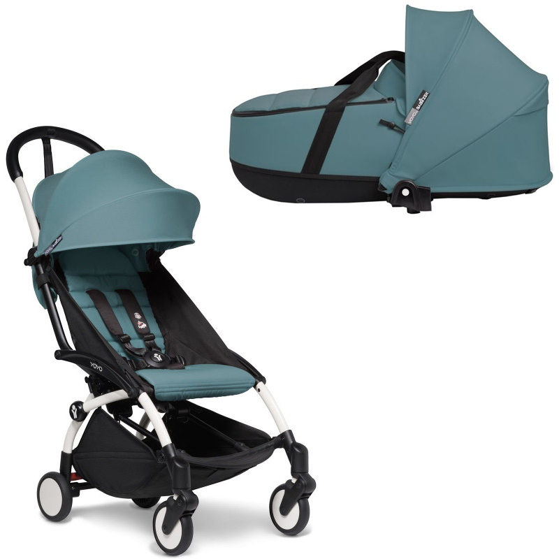 Комплект коляски 2 в 1 складається з білого шасі YOYO², люльки Bassinet Aqua та текстилю для прогулянкового блоку Yoyo Plus 6+ Aqua.
