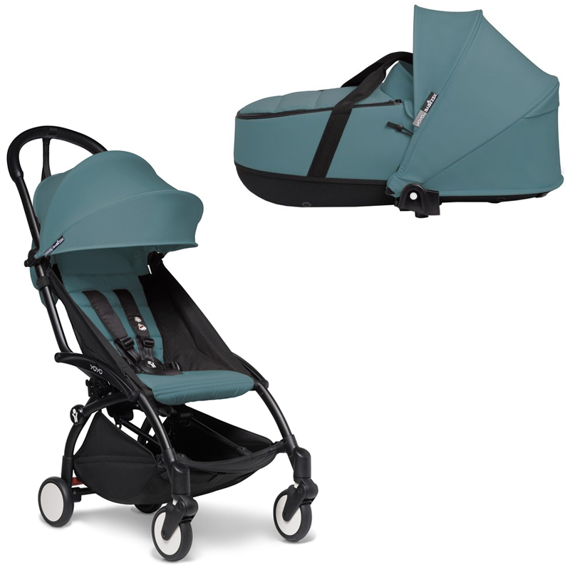 Комплект коляски 2 в 1 складається з чорного шасі YOYO², люльки Bassinet Aqua та текстилю для прогулянкового блоку Yoyo Plus 6+ Aqua.