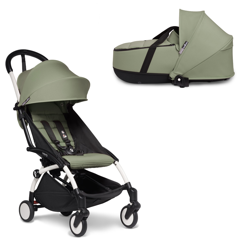 Комплект коляски 2 в 1 складається з білого шасі YOYO², люльки Bassinet Olive та текстилю для прогулянкового блоку Yoyo Plus 6+ Olive.