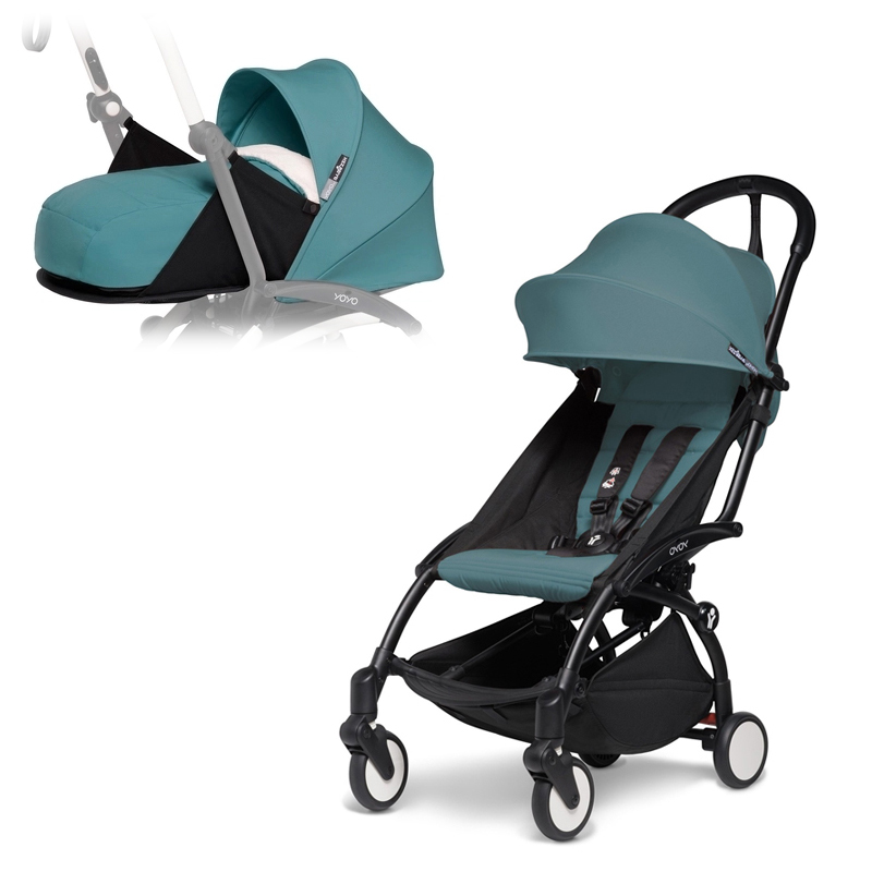 Комплект коляски 2 в 1 складається з чорного шасі YOYO², люльки Yoyo 0+ Aqua та текстилю для прогулянкового блоку Yoyo Plus 6+ Aqua.