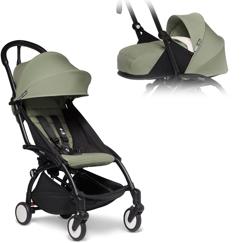 Комплект коляски 2 в 1 складається з чорного шасі YOYO², люльки Yoyo 0+ Olive та текстилю для прогулянкового блоку Yoyo Plus 6+ Olive.