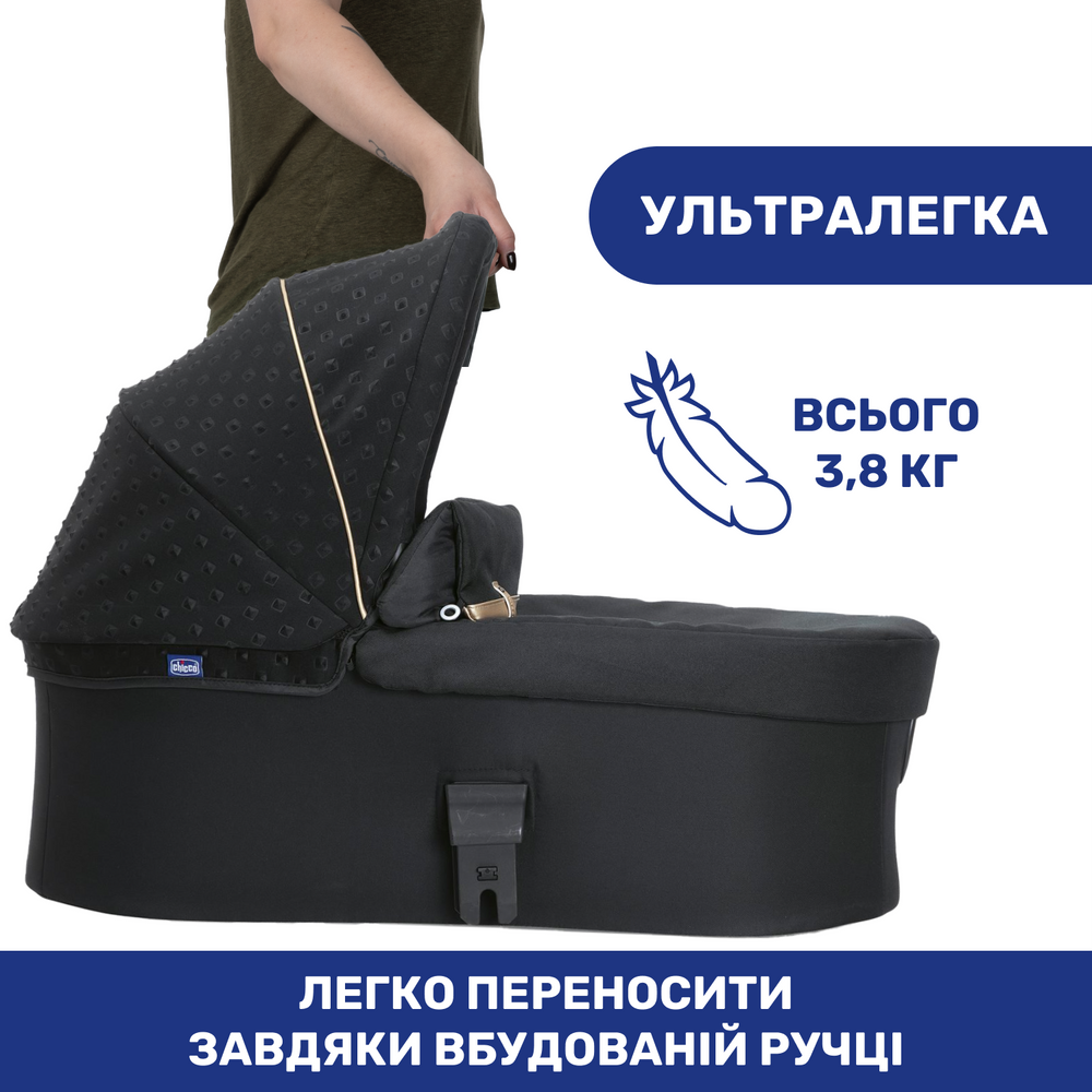 ✔ Легка конструкція (всього 3.8 кг) і вбудована в капюшон пластикова ручка дають змогу переносити дитину в люльці