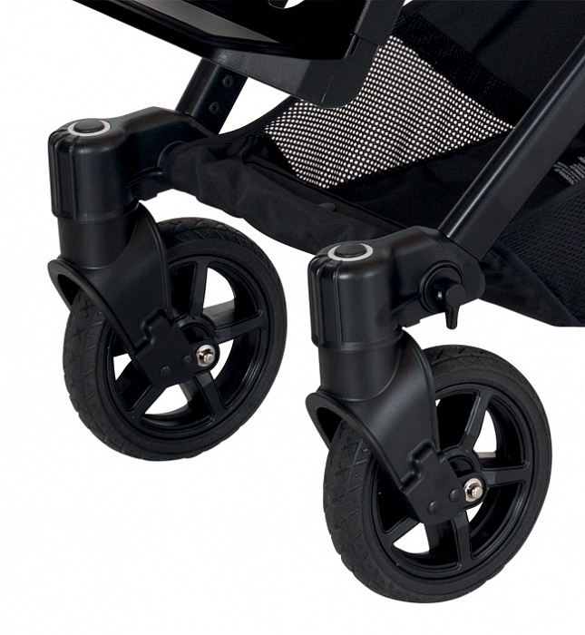 Дана модель коляски є найлегшою, маневреною та компактною у лінійці колясок Hartan. Передні поворотні колеса мають можливість блокування поганих доріг, а система амортизації на обидві осі забезпечить плавний хід, простоту і легкість управління коляскою. Ручка коляски телескопічна та обтягнута якісною екошкірою. Положення ручки може регулюватися по висоті однією рукою.