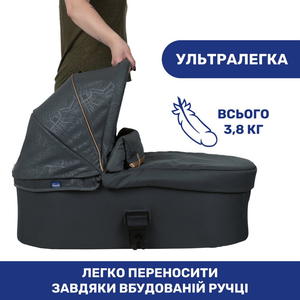 ✔ Легка конструкція (всього 3.8 кг) і вбудована в капюшон пластикова ручка дають змогу переносити дитину в люльці