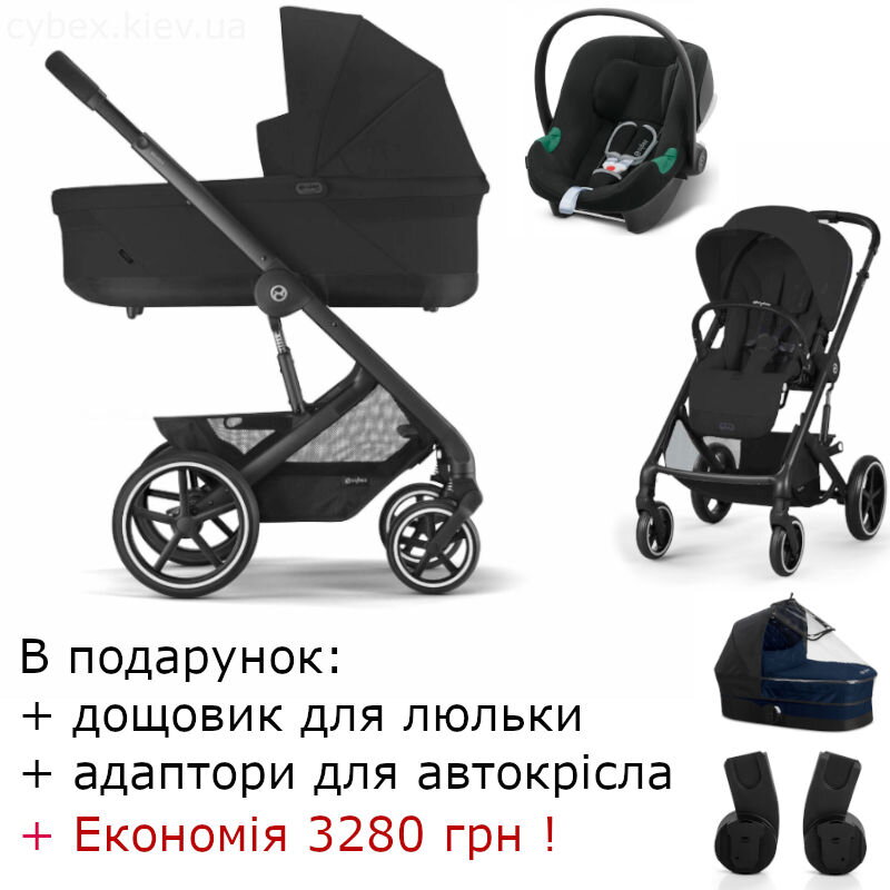 Коляска Cybex Balios S Lux 3 в 1 комплектується: шасі з колесами, прогулянковий блок з бампером, люлька, нижня корзина для покупок, автокрісло, адаптери для встановлення автокрісла на шасі.