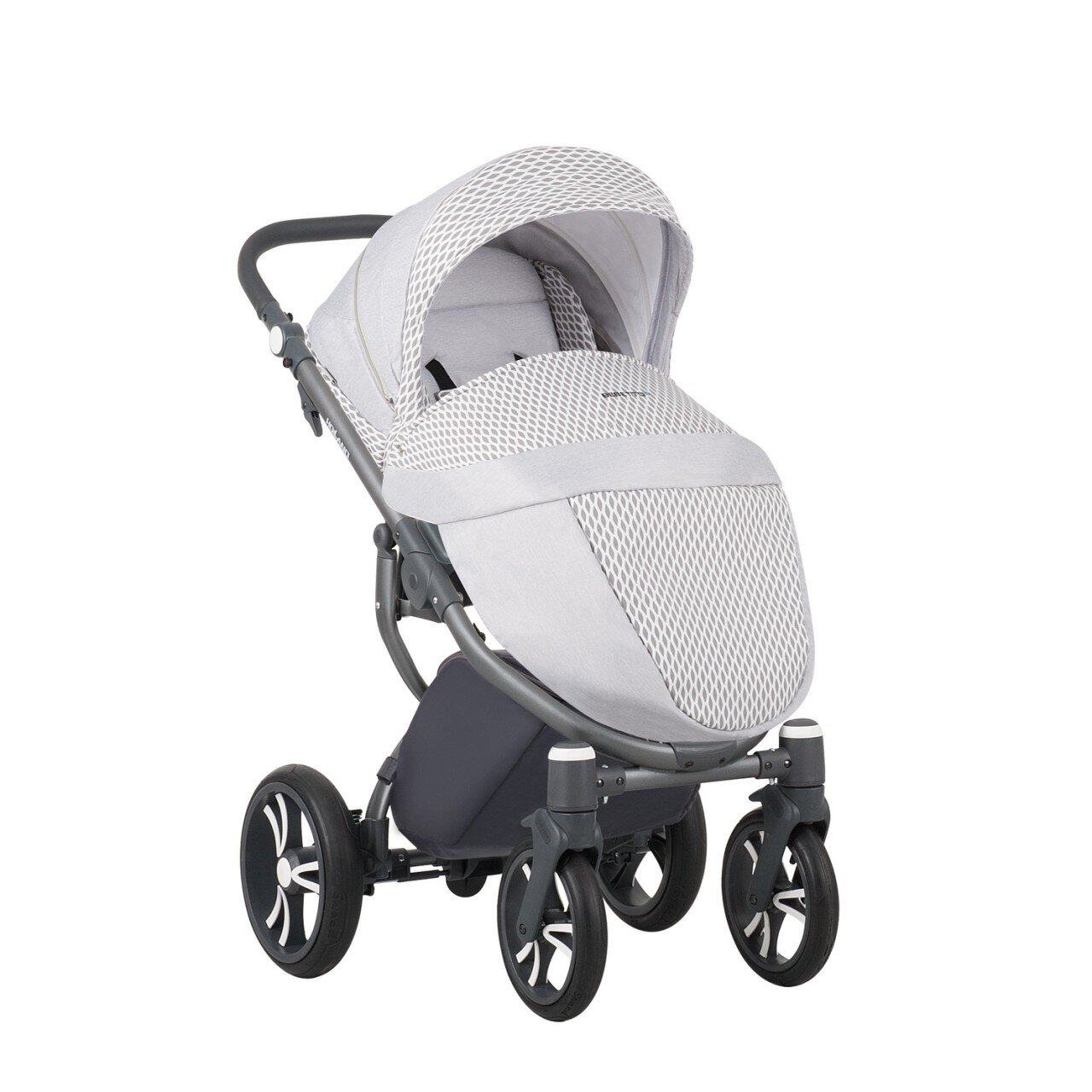 Конструкція: Алюмінієве шасі легке і надійне; Система складання "одним натисканням" - нова вдосконалена, більш безпечна, висока міцність механізму складання; Запатентована система амортизації DMS; Запатентована система поглинання коливань SAS; Амортизатори на задніх колесах з регулюванням жорсткості; Передні колеса обертаються на 360 °, фіксуються для пересування "прямо"; Пневматичні колеса оснащені підшипниками; Новий гальмівний механізм Stop & Go - зручна педаль гальма, надійне блокування коліс; Система висувної осі колеса - вісь одним натисканням ховається/висувається всередину конструкції; Простий механізм установки і зняття люльки і прогулянкового блоку; Установка люльки і прогулянкового блоку в обох напрямках ходу коляски; Ручка ергономічна, оббита еко-шкірою, регулюється на 180°; Матеріал для оббивки коляски виготовляється c технологією UV50 + для захисту від УФ-випромінювання.