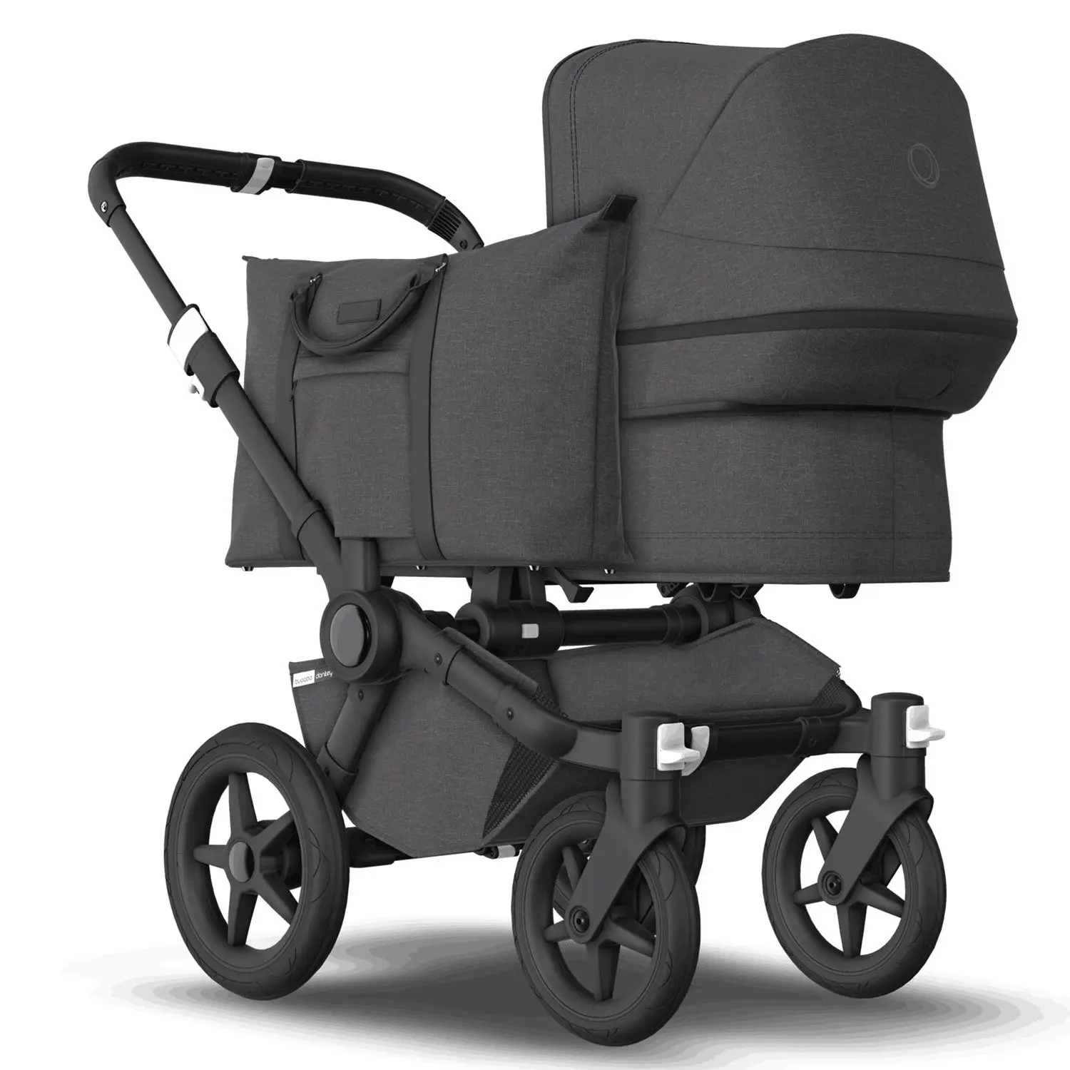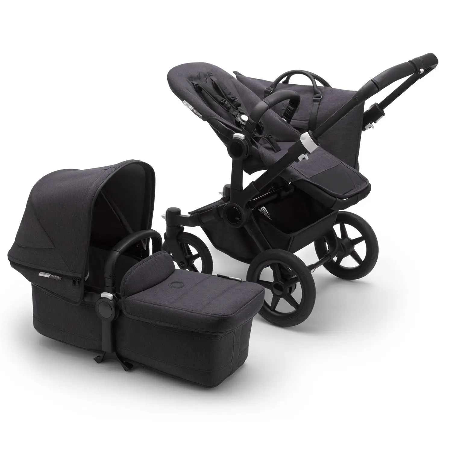 Комплектація Bugaboo універсальної коляски Donkey3 Mono: шасі з колесами, рама сидіння/люльки, текстиль для люльки з матрациком, накидкою на ніжки та дном, текстиль сидіння з ременями безпеки, капюшон, дуги та кріплення для капюшона, боковий кошик-сумка, нижній кошик.