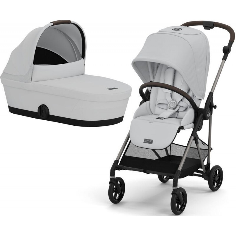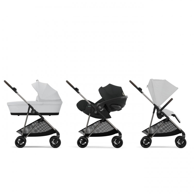 Коляска Cybex Melio 2 в 1 комплектується: шасі з колесами, люлька, прогулянковий блок з бампером, нижня корзина для покупок.
