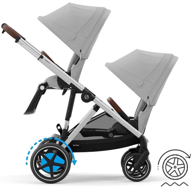 Cybex eGazelle для погодок має колеса з можливістю блокування, які дозволять з комфортом проїхати як по міських дорогах, так і по піщаному пляжу. Телескопічна ручка, регулюється в 4 положеннях, підлаштовуючись під різний зріст батьків. У складеному стані коляска може стояти самостійно. Коляска Cybex Gazelle S має просторий і доступний кошик для покупок. Ваші продукти з легкістю помістяться в кошику для покупок.