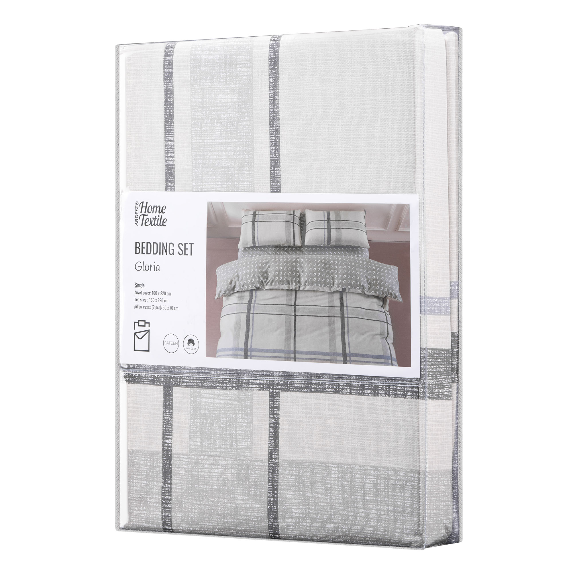 Комплект постільної білизни Gloria – це поєднання витонченого дизайну й безкомпромісної якості. Вироблена зі 100 % бавовняного сатину щільністю 200 ТС, постіль подарує винятковий комфорт і затишок. М’яка тканина ніжно пестить шкіру, забезпечуючи її дихання і створюючи відчуття свіжості та легкості. Стильний клітчастий дизайн у ніжному відтінку тауп додає спальному місцю особливого шарму та спокою.