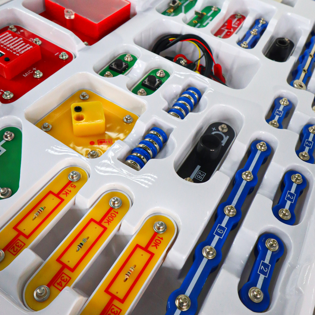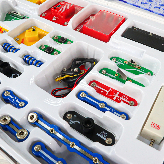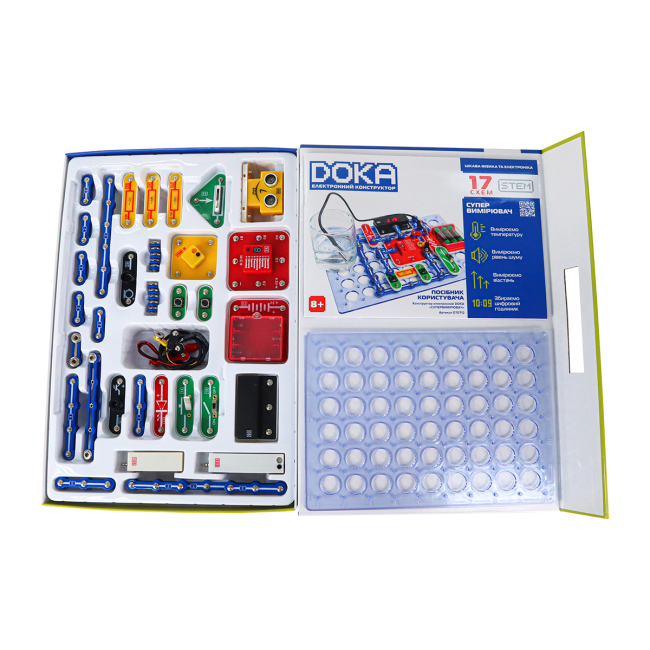 Він знайомить з неймовірним світом електроніки в ігровій формі! Як вимірювати звук, яку температуру має вода в стакані чи яке освітлення у приміщенні – усе це ви зможете дізнатися, зібравши й випробувавши схеми самостійно! Завдяки оригінальному способу з’єднання деталей ви зможете швидко і легко створювати різноманітні схеми без паяння!