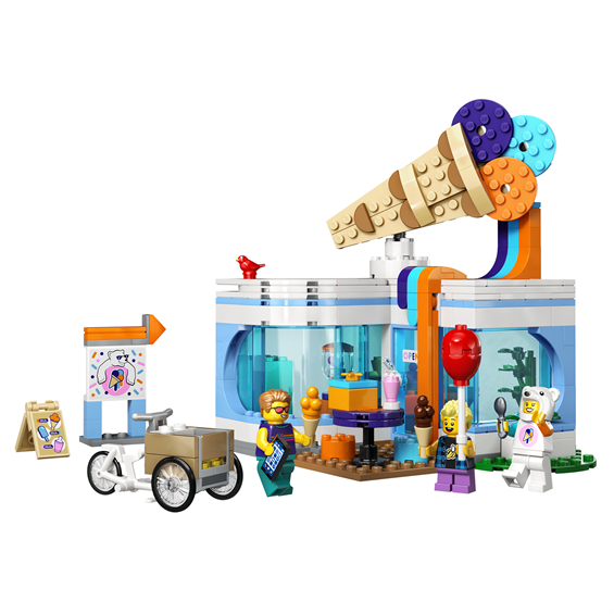 • Що всередині? — Усе необхідне дітям для створення іграшкової крамниці морозива й вантажного велосипеда, а також веселі аксесуари й три мініфігурки, серед яких продавчиня в костюмі білого ведмедя