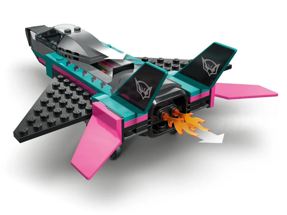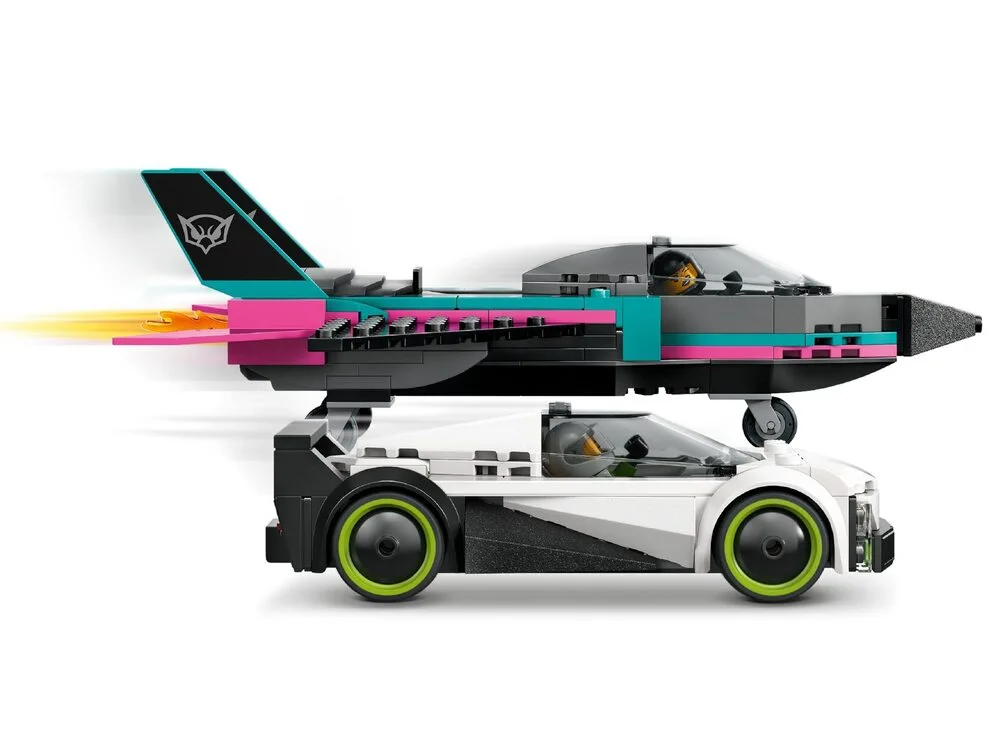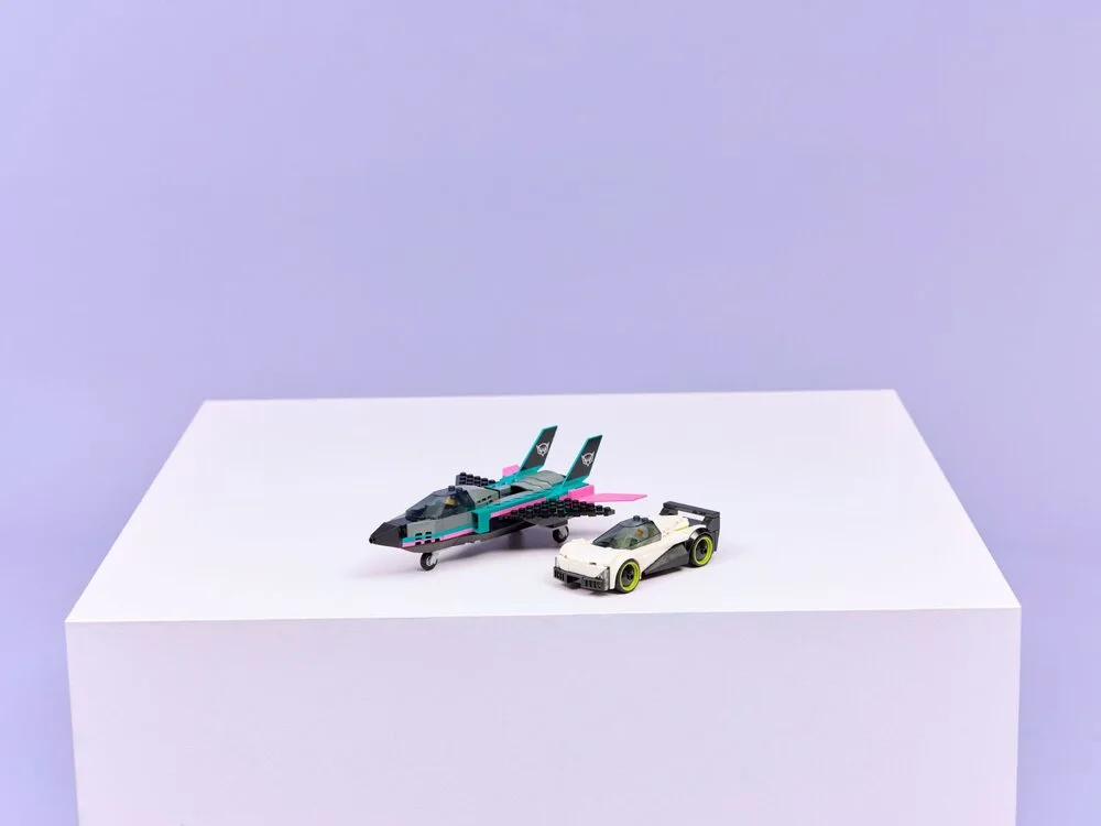 LEGO City Реактивний літак проти автомобіля (60489) — динамічний набір для дітей від 6 років, що містить два швидкісні транспортні засоби: надзвуковий реактивний літак з відкидними крилами, подвійним вертикальним хвостом і стабілізаторами та суперкар з деталізованим салоном і сидінням для перегонів. Діти можуть посунути важіль, щоб увімкнути форсаж реактивного двигуна, та відкрити кабіну суперкара для рольових ігор. У комплекті мініфігурки пілота та водія для епічних перегонів і сюжетів. Набір розвиває уяву, швидкість реакції та любов до змагань. Містить 259 деталей та інструкції в додатку LEGO Builder з 3D-переглядом.