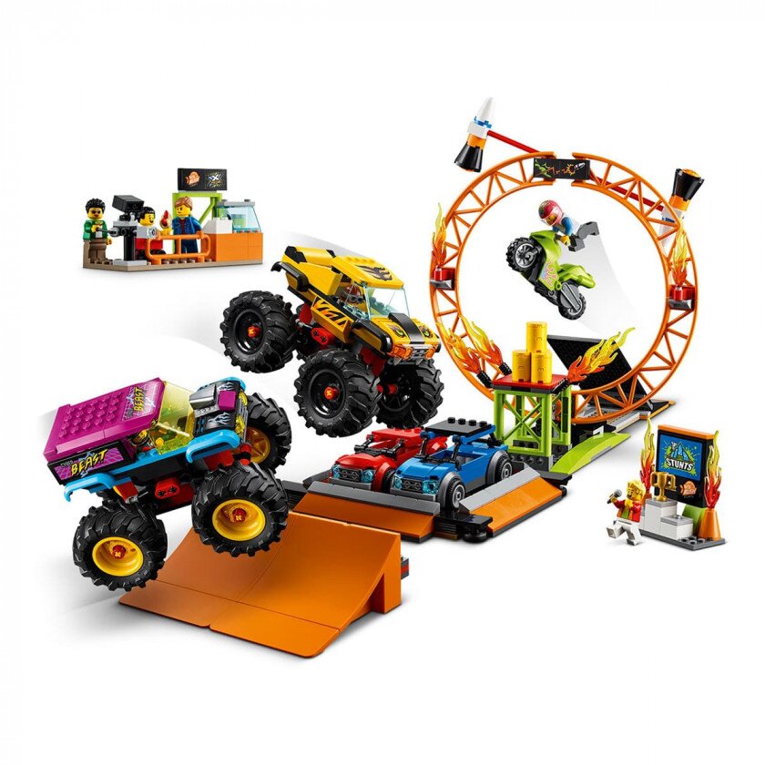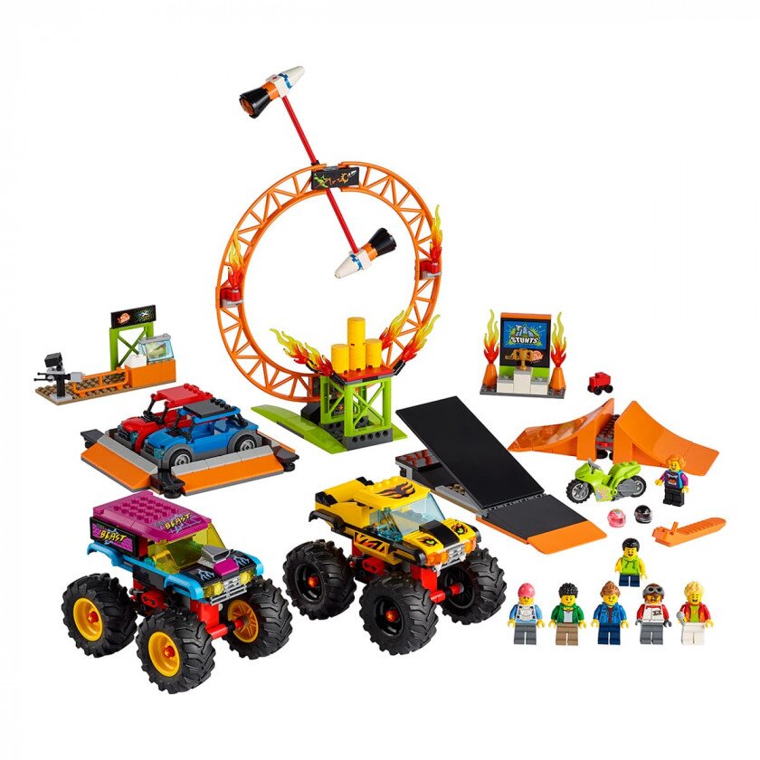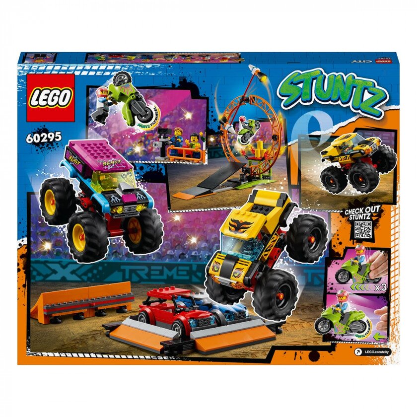 Ігрові набори LEGO® City занурюють дітей в реалістичний світ відкриттів і досліджень. Їм подобається будувати захоплюючий набір багатофункціональних будівель і транспортних засобів різного призначення. Кожен конструктор складається з продуманих деталей і аксесуарів, які надихають на творчі ролеві ігри і пригодницькі історії. Кубики і деталі LEGO® проходять тестування і відповідають прийнятим всесвітнім стандартам безпеки. Приєднуйтеся до персонажів серіалу Лего Сіті з конструктором LEGO® 60295 Stuntz Арена каскадерського шоу. Водіть монстр-тракі, сальто, що роблять назад, і машини, що крушать, і запускайте мотоцикл з крутнем через вогняне кільце з ракетами, що обертаються. Виконуйте захоплюючі трюки для телекамери і здійснюйте рекордні стрибки, щоб забрати золотий кубок, піднявшись на п'єдестал пошани!