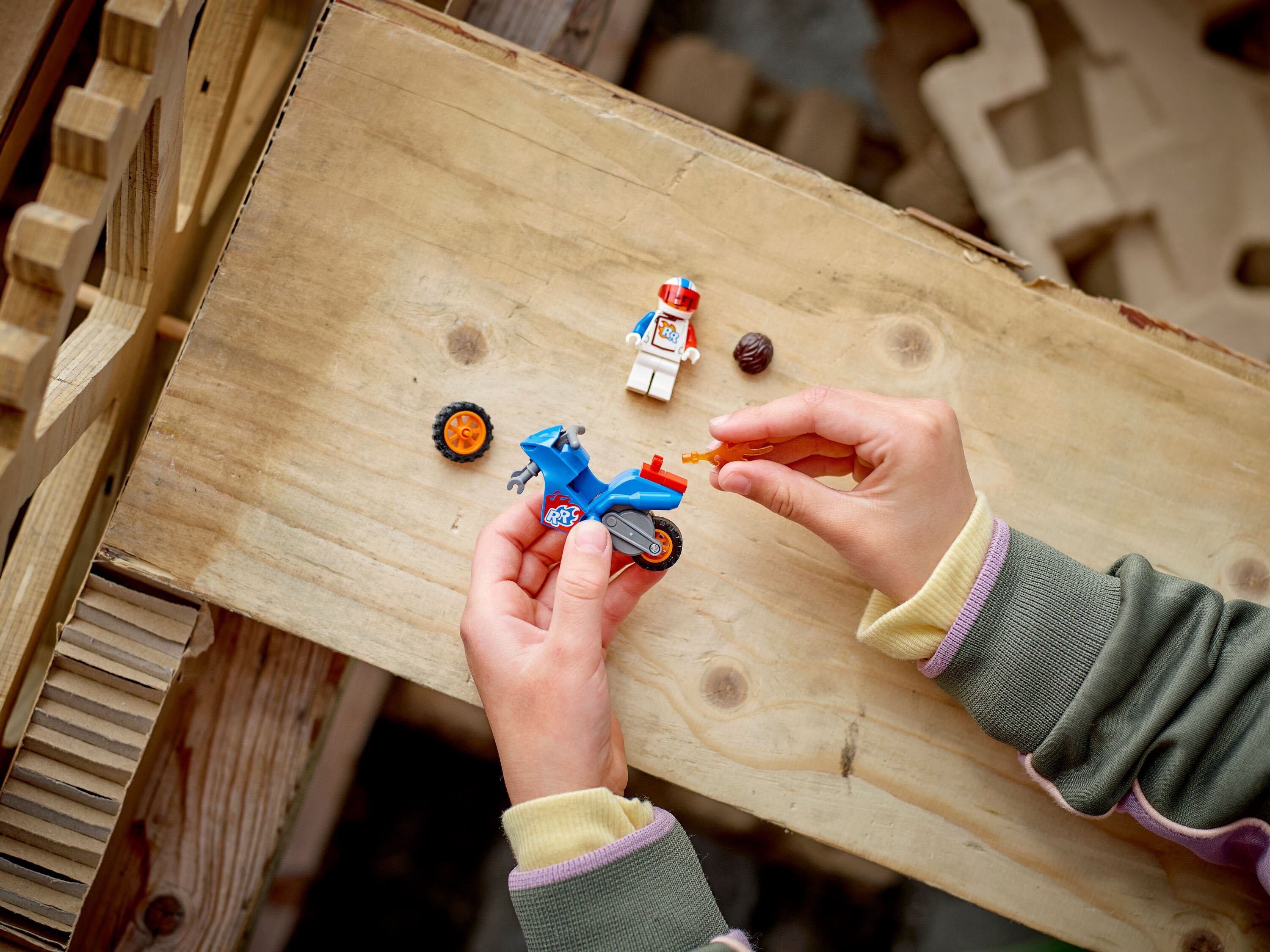 Заводь каскадерський мотоцикл із маховиком і приготуйся до справжнього видовища на висоті з каскадерами LEGO City! Приєднуйся до героя серіалу LEGO City гонщика Rocket Racer за кермом його крутої машини. Запусти дивовижний каскадерський мотоцикл-ракету та злітай із рамп, щоб виконати рекордні стрибки, видовищні маневри в повітрі й приземлення на одне колесо. Цей водій у броні не знає, що таке страх висоти, тож хапай свій захисний шолом і приготуйся до наступного польоту!
