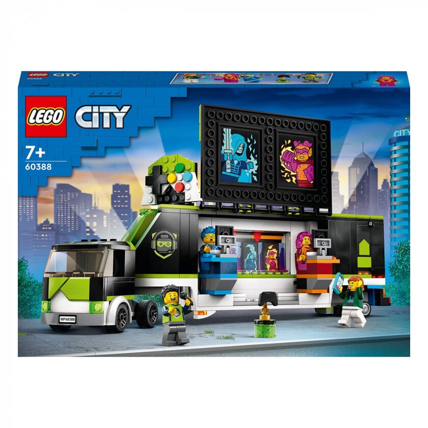 Вантажівка для ігрового турне прибула до LEGO City для великого матчу між чемпіонами з кіберспорту. Ця вантажівка завантажена крутим обладнанням і мерчем для захоплених фанатів. Допоможіть ведучому підготуватися до передачі. Підніміть частину величезного причепа, щоб відкрити сцену з двома ігровими станціями й величезним екраном стадіону. Хто виграє приз? Отож розпочнімо турнір.