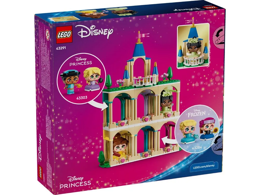 LEGO Disney 43291 — це чарівний набір для дітей від 5 років з двома рухомими мініпринцесами: Бель (з книжкою) та Тіаною (з ложечкою) з мультфільмів Disney. Доданий трирівневий замок з кімнатами в кольорах кожної принцеси, центральна вежа з обертовою платформою для демонстрації фігурок та аксесуари для сюжетних ігор. Це ідеальний спосіб розвивати уяву через історії принцес та використовувати модель як милу експозицію. Додаток LEGO Builder з 3D-інструкціями полегшує складання. Чудовий подарунок для фанатів Бель, Тіани та колекції Disney Princess.