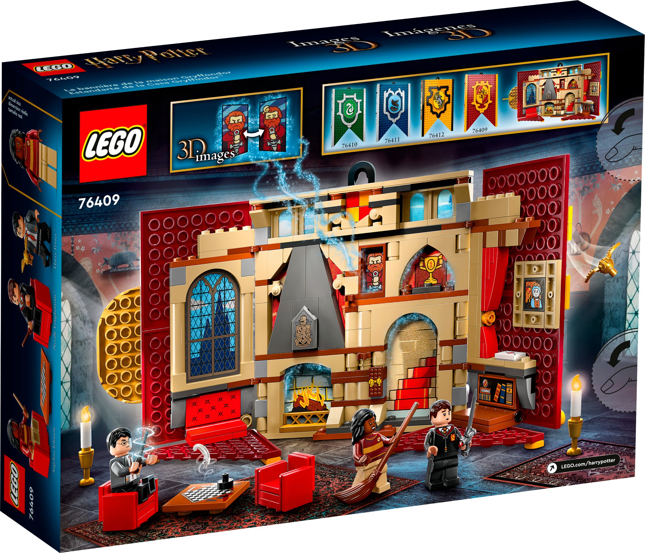 Шанувальники Гаррі Поттера можуть продемонструвати свою гордість за гуртожиток Ґрифіндор з допомогою цього прапора, що складається з кубиків, від LEGO. Це чудовий подарунок на кожен день дітям віком від 9 років, який містить плитку з тисненням герба Ґрифіндору й вішак, щоб гордо повісити прапор на стіні. Він також відкривається, щоб показати чарівне втілення загальної кімнати Ґрифіндору з автентичними деталями, включно з каміном, кріслом і шаховою дошкою. Випукла задня панель, що висувається, створює магічні 3D ефекти, як-от зображення Сіріуса Блека, який з'являється у вогні, і трофей, що вручається 1-му або 4-му місцю.