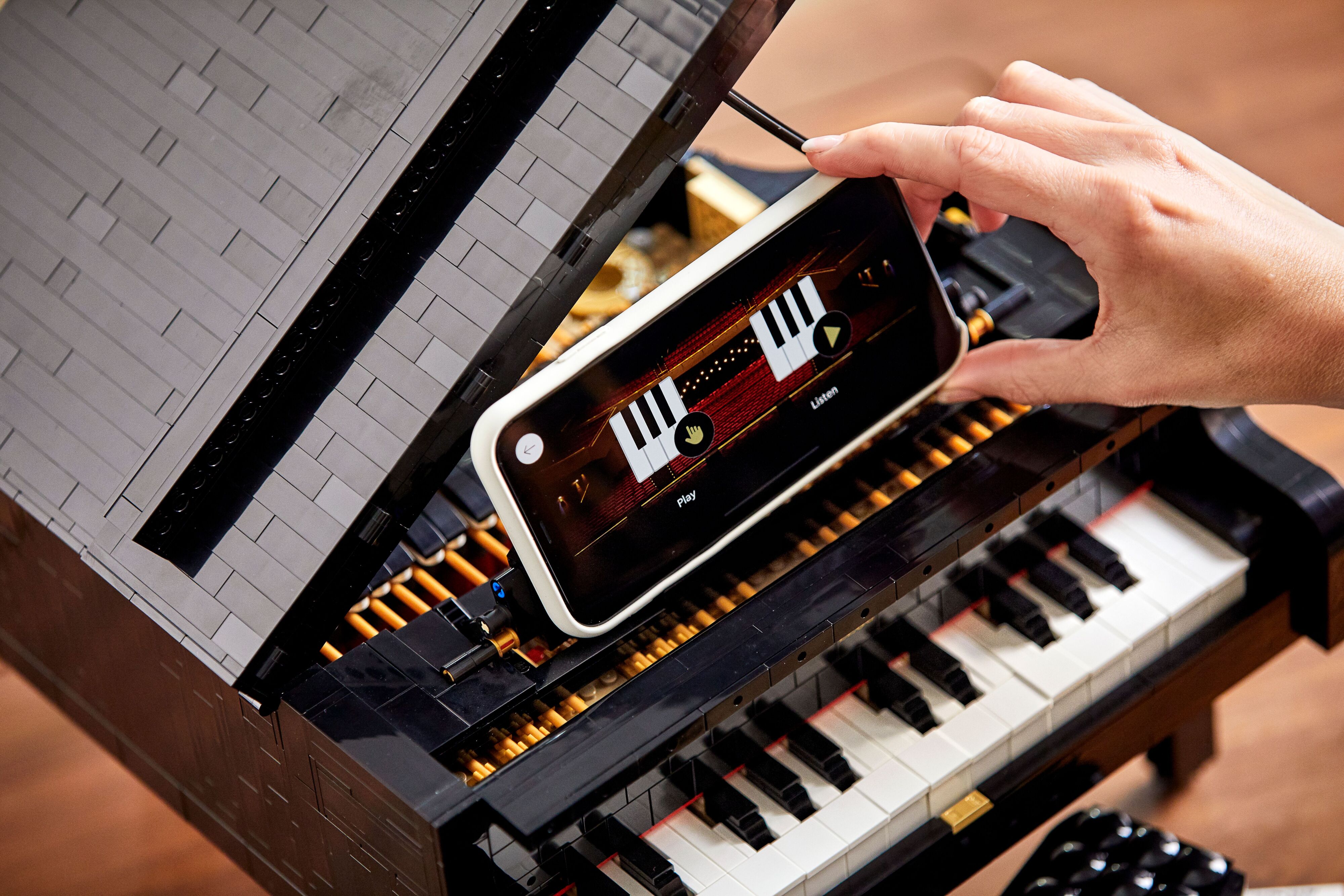 Відтворіть звук удару молоточка по кожній клавіші піаніно, рухому педаль та автентичні деталі, такі як верхня кришка, що відкривається на підставці, і деки. Увімкніть двигун, під'єднатися до додатка, і все готово - оберіть режим гри користувача у безкоштовному додатку LEGO Powered Up і натискайте клавіші самостійно або активуйте автоматичне відтворення, щоб слухати пісні.