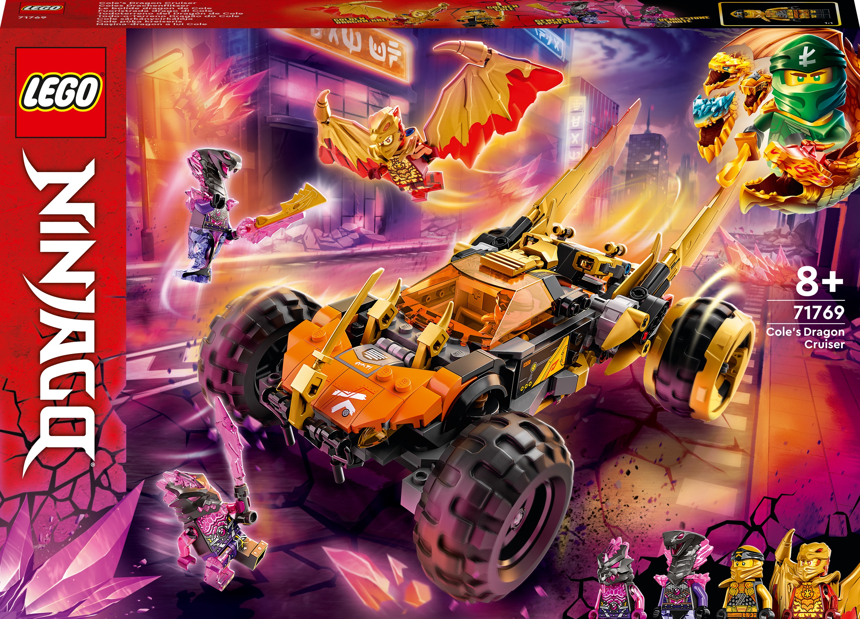 Набір конструктор LEGO NINJAGO Крейсер Дракона Коула дозволить дітям віком від 8 років розіграти захоплюючі сцени із серіалу NINJAGO: Crystallized. Ця машина ніндзя може похвалитися вражаючими золотими мечами-блискавками, які можна висувати вперед у режимі атаки дракона, двома шиповими шутерами, чотирма великими колесами та сидіннями для водія та пасажира, куди можна посадити мініфігурки.